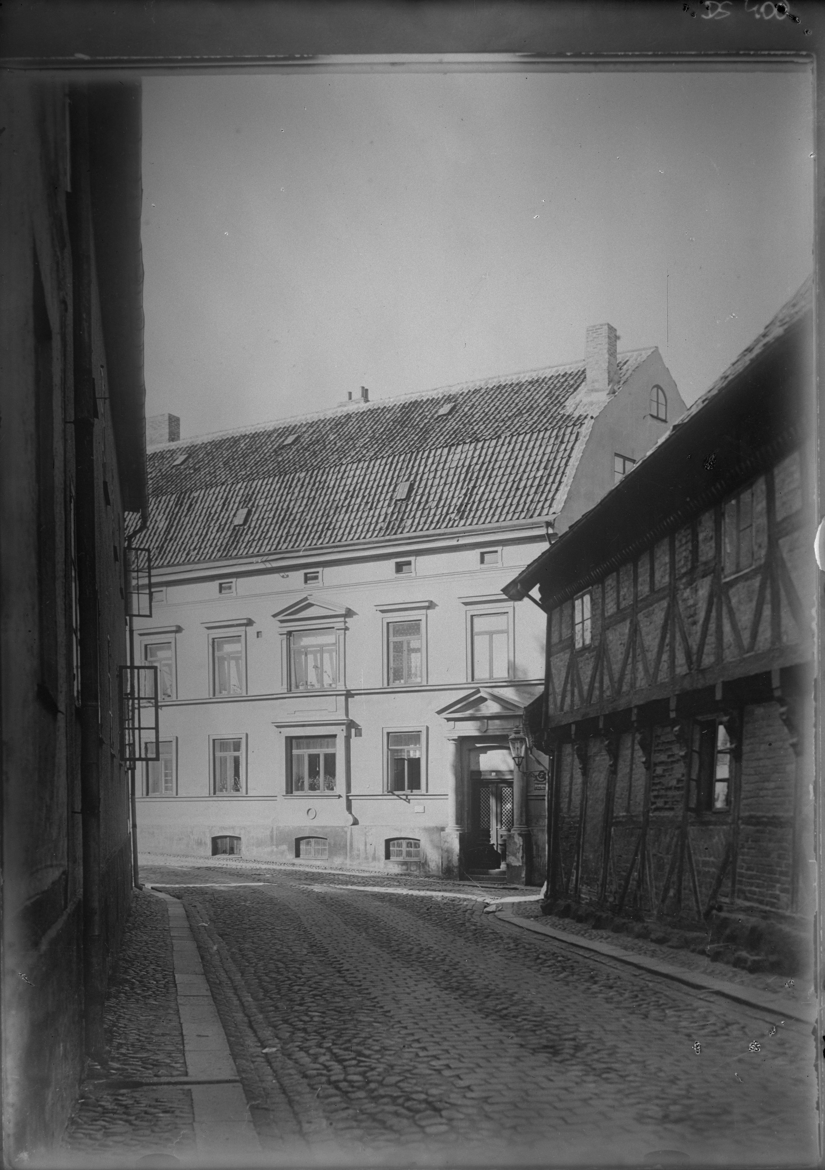 Beskrivning: Gatubild bl.a. ett korsvirkeshus. "Skandinaviska Kredit AB.
