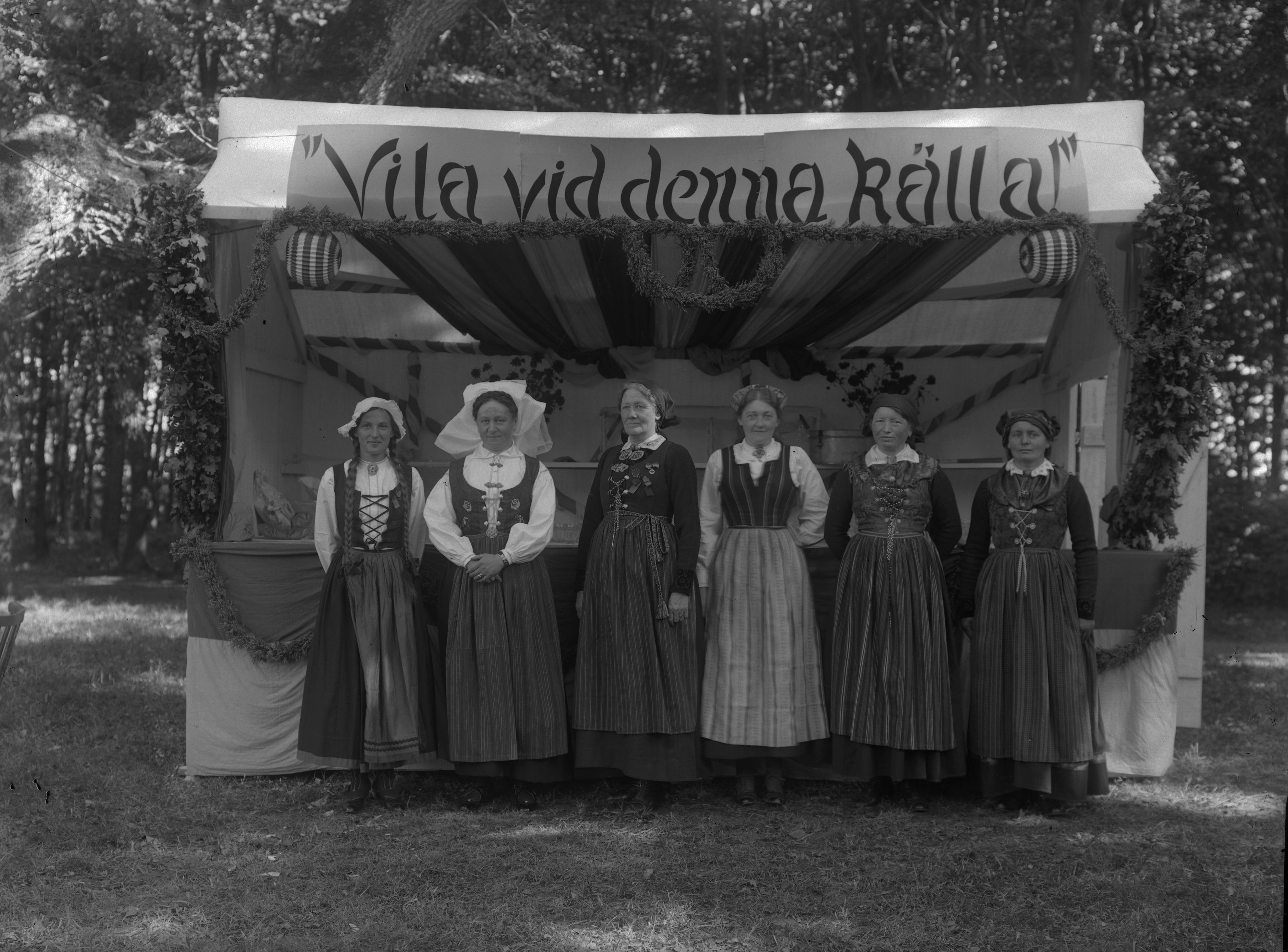 Beskrivning: Sex kvinnor i nationaldräkter vid stånd med parollen "Vila vid denna källa."