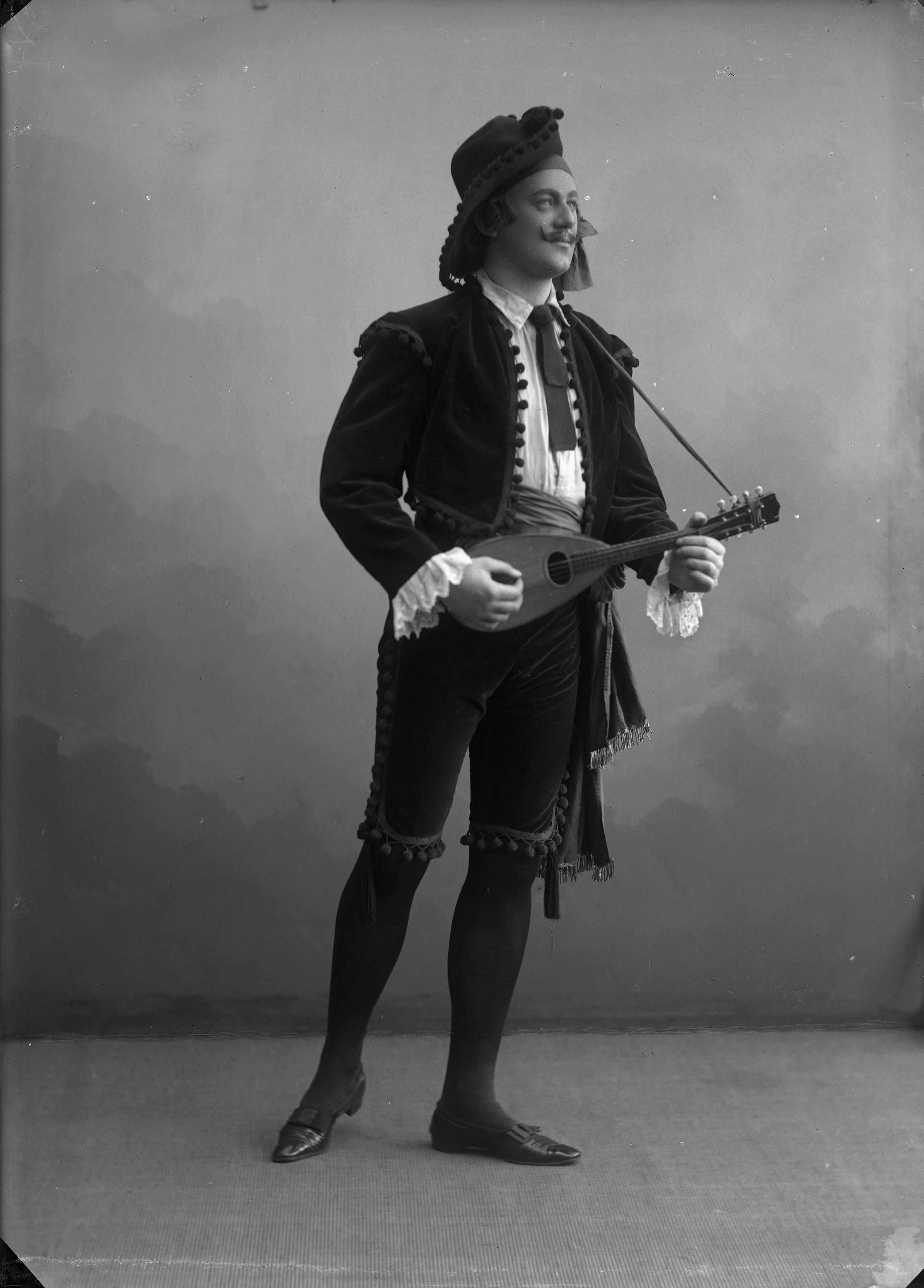 "Ottoson." Man med mandolin, hatt. Helfigur.