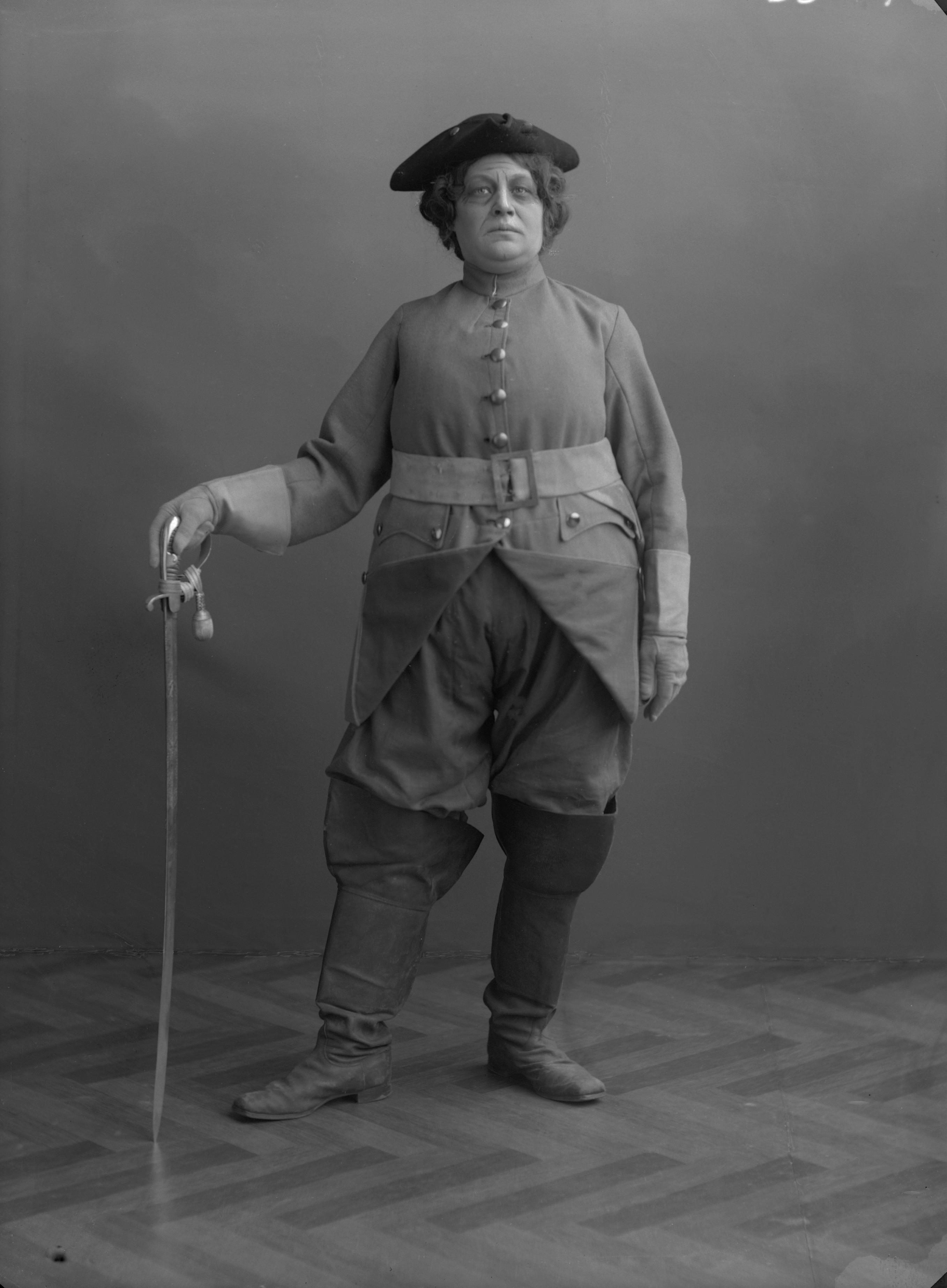 Beskrivning: Porträtt i helfigur av medlem ur Lianders teatersällskap. Man i gammal valfora.