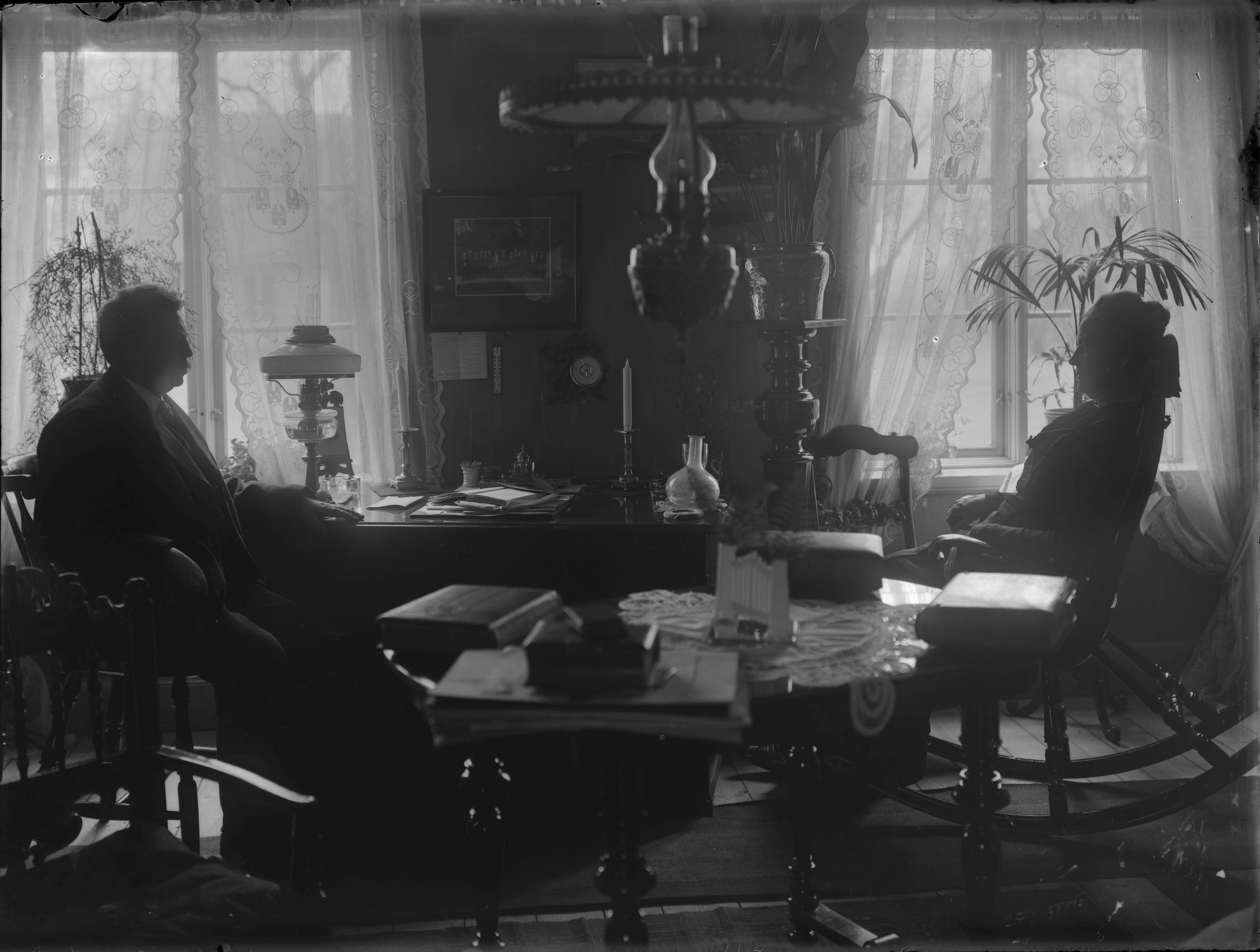 Rumsinteriör, Sjöberg vid skrivbord och en kvinna.