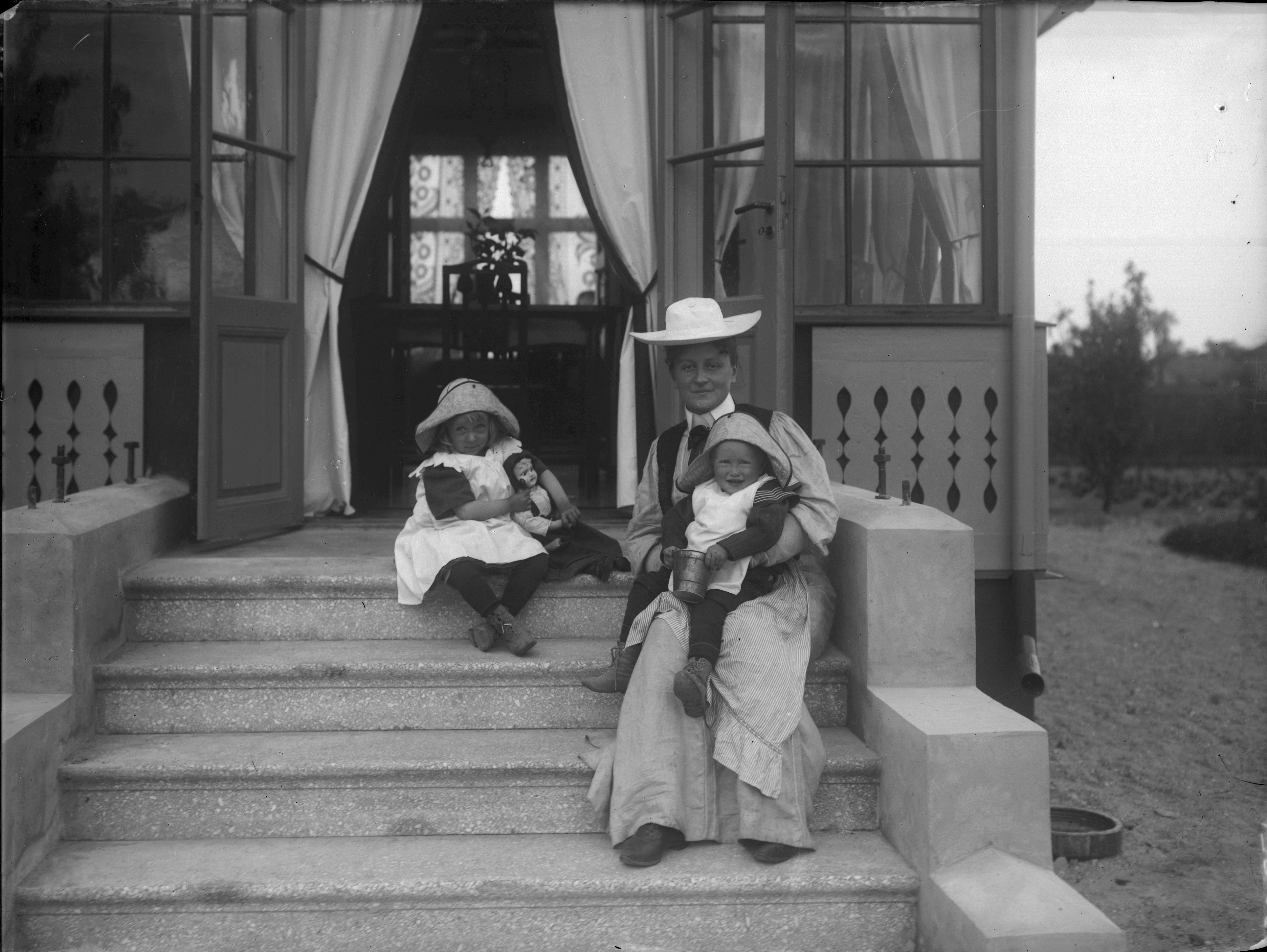 Beskrivning: Kvinna med två barn vid hustrappan.