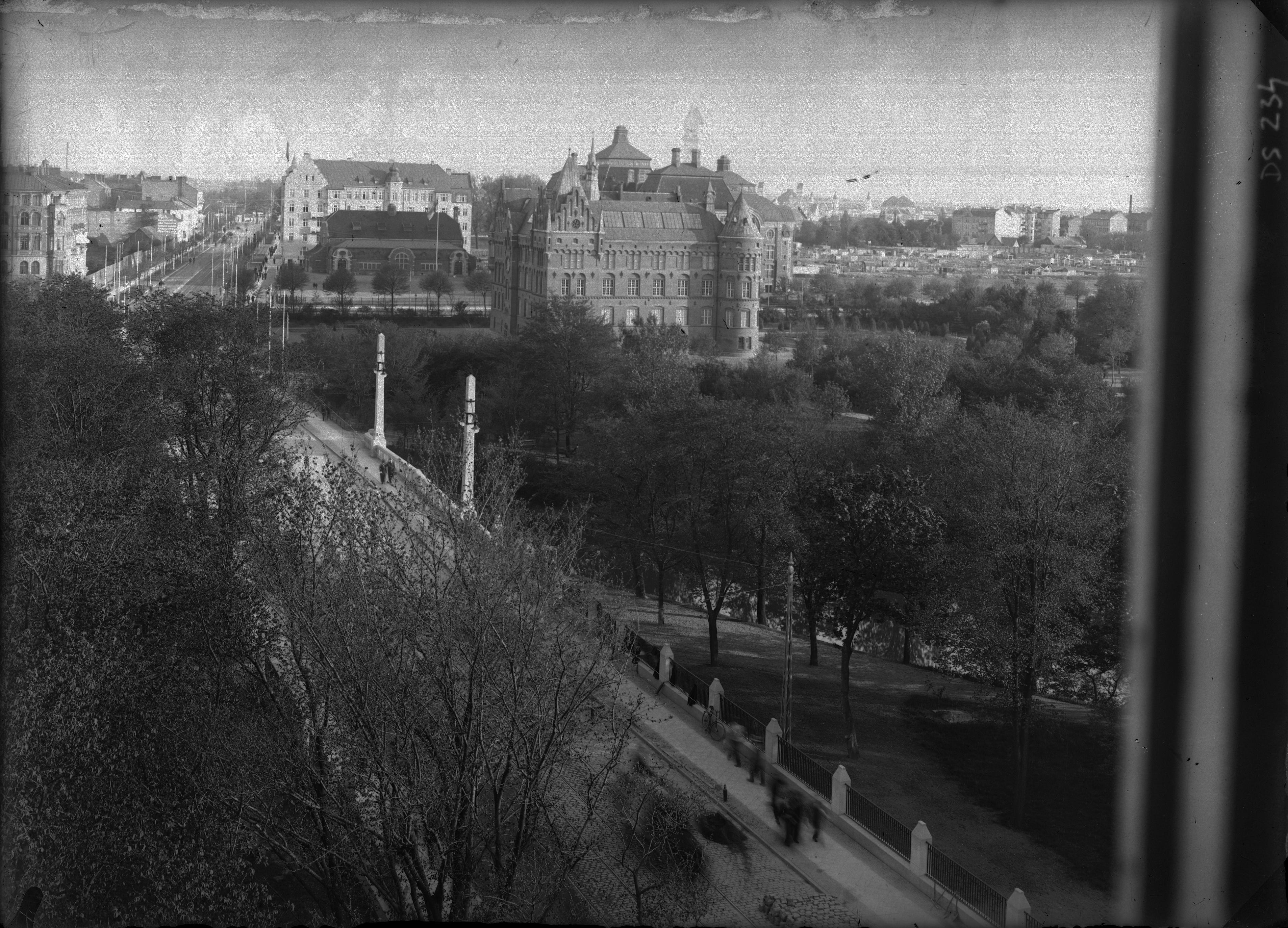 Gatubild, från högt fönster. Fersens bro/väg bibl.