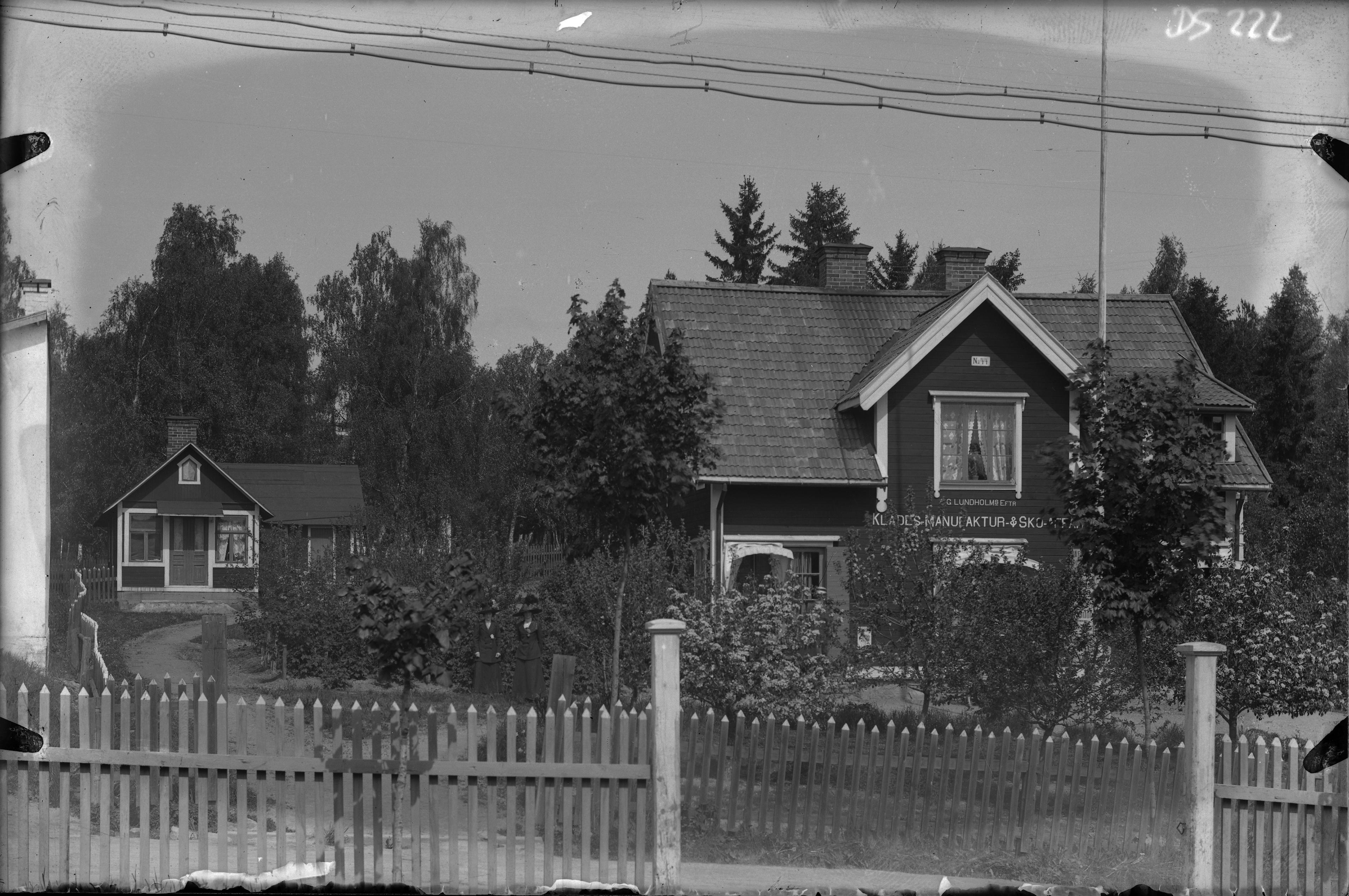 Villa och stuga, i trädgården. G. Lundholms efh. Klädesmanufaktor och skoaffär.