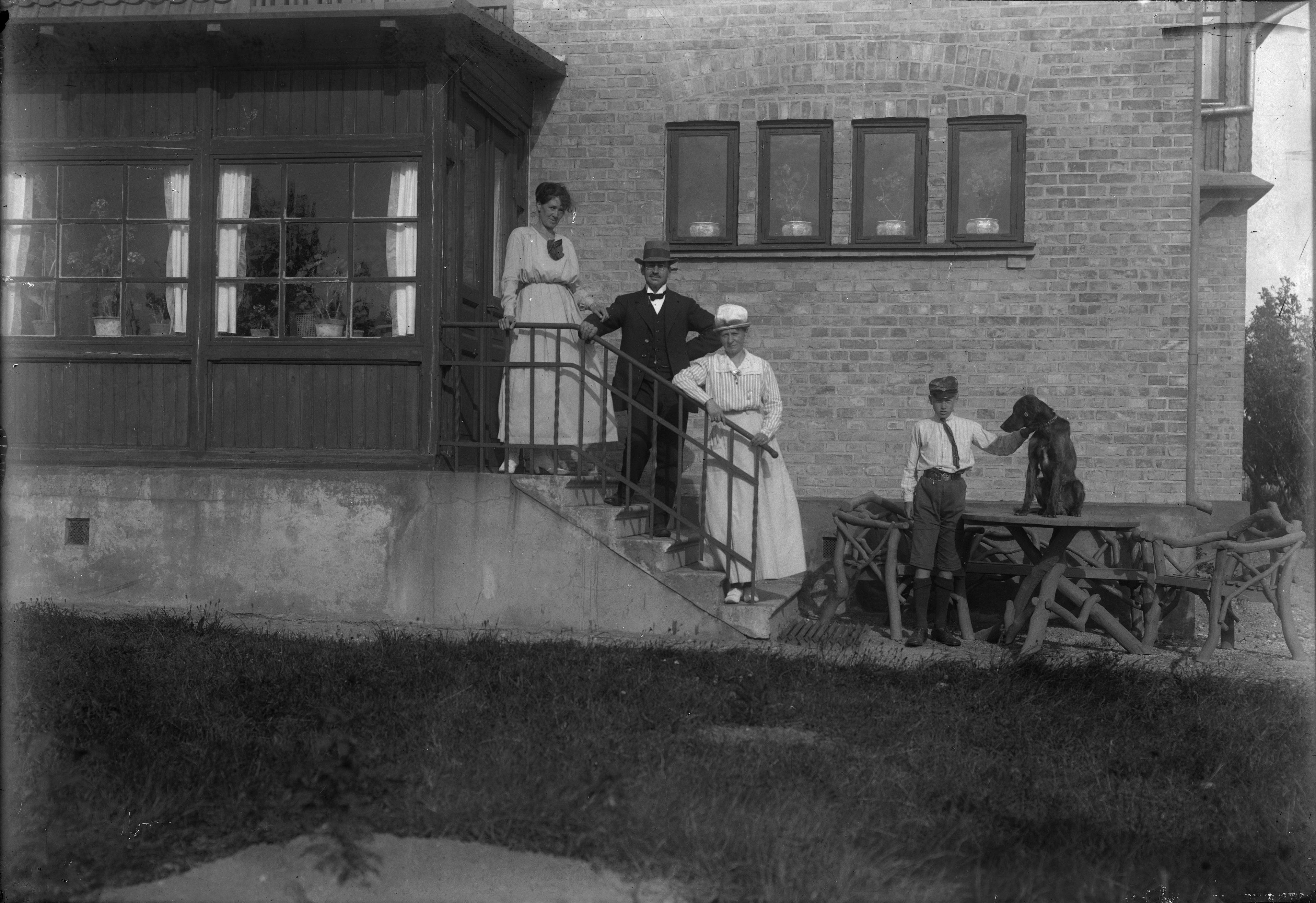 Villa exteriör, två kvinnor, man, pojke med hund.