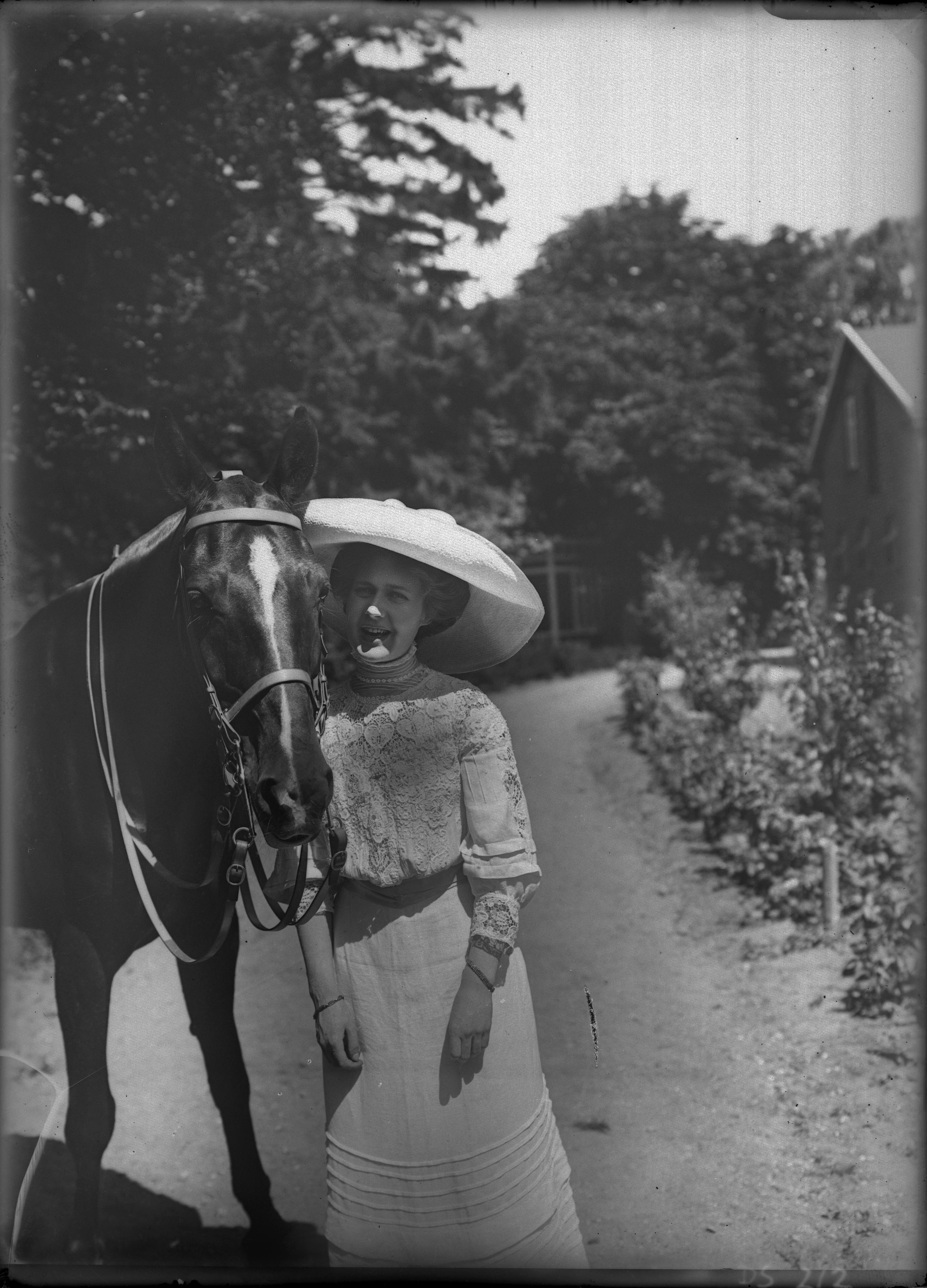 Beskrivning: Häst i trädgården. Dubbelporträtt med frk M.