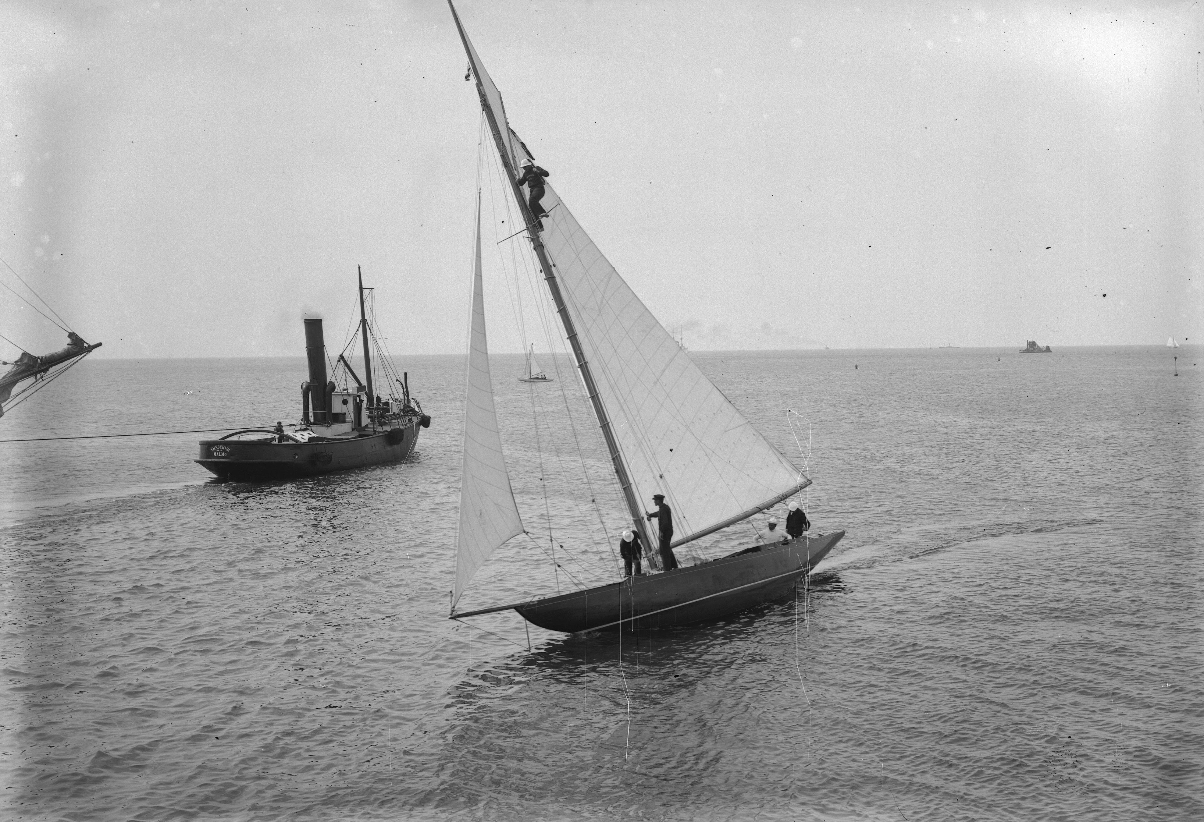 Segelbåt och bogserbåten. Från höger, Kockums.