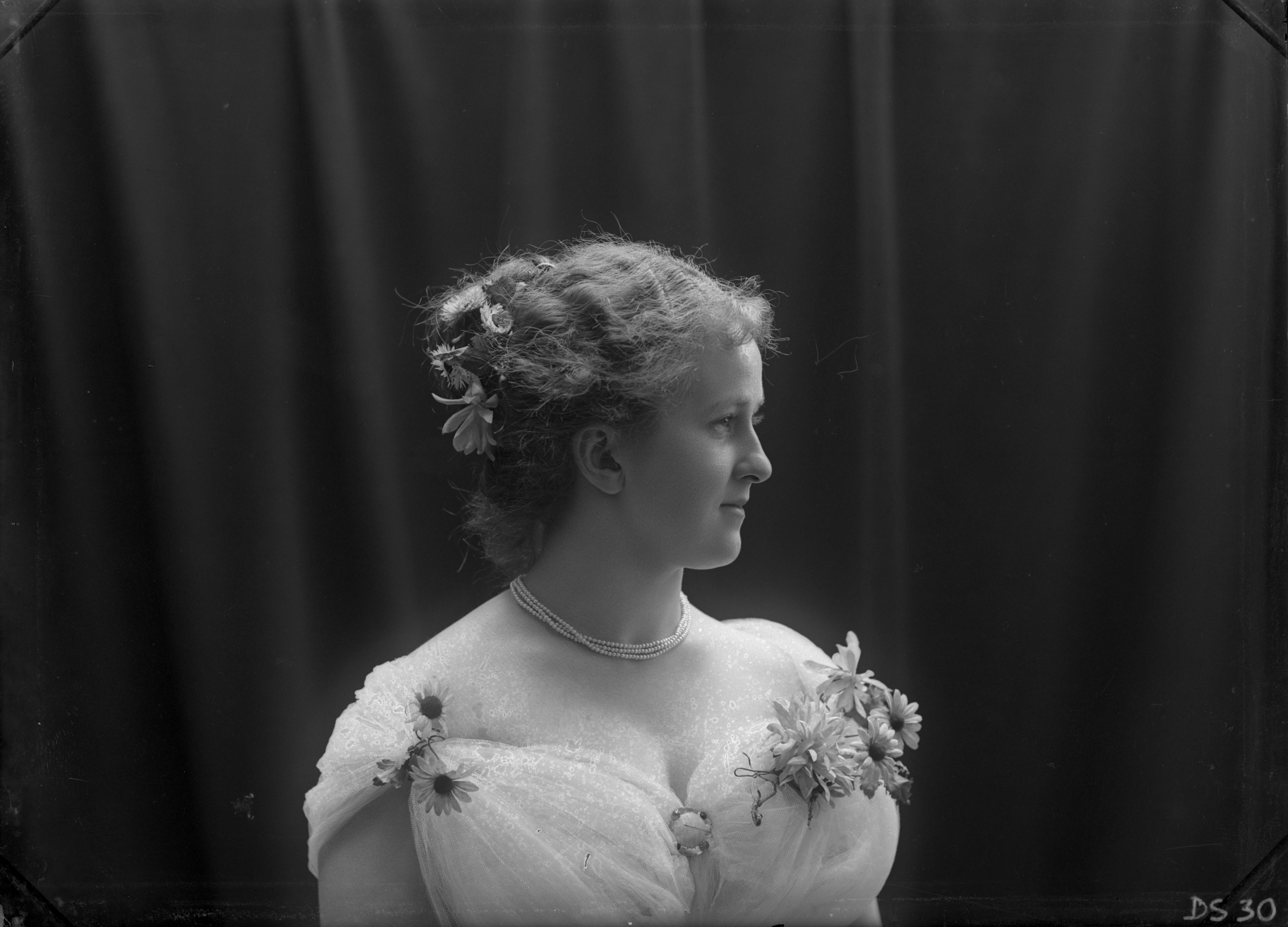 Porträtt i helfigur av Elsa Thavesin, ansikte i profil. Hon bär konsblommor i håret och på bröstet.