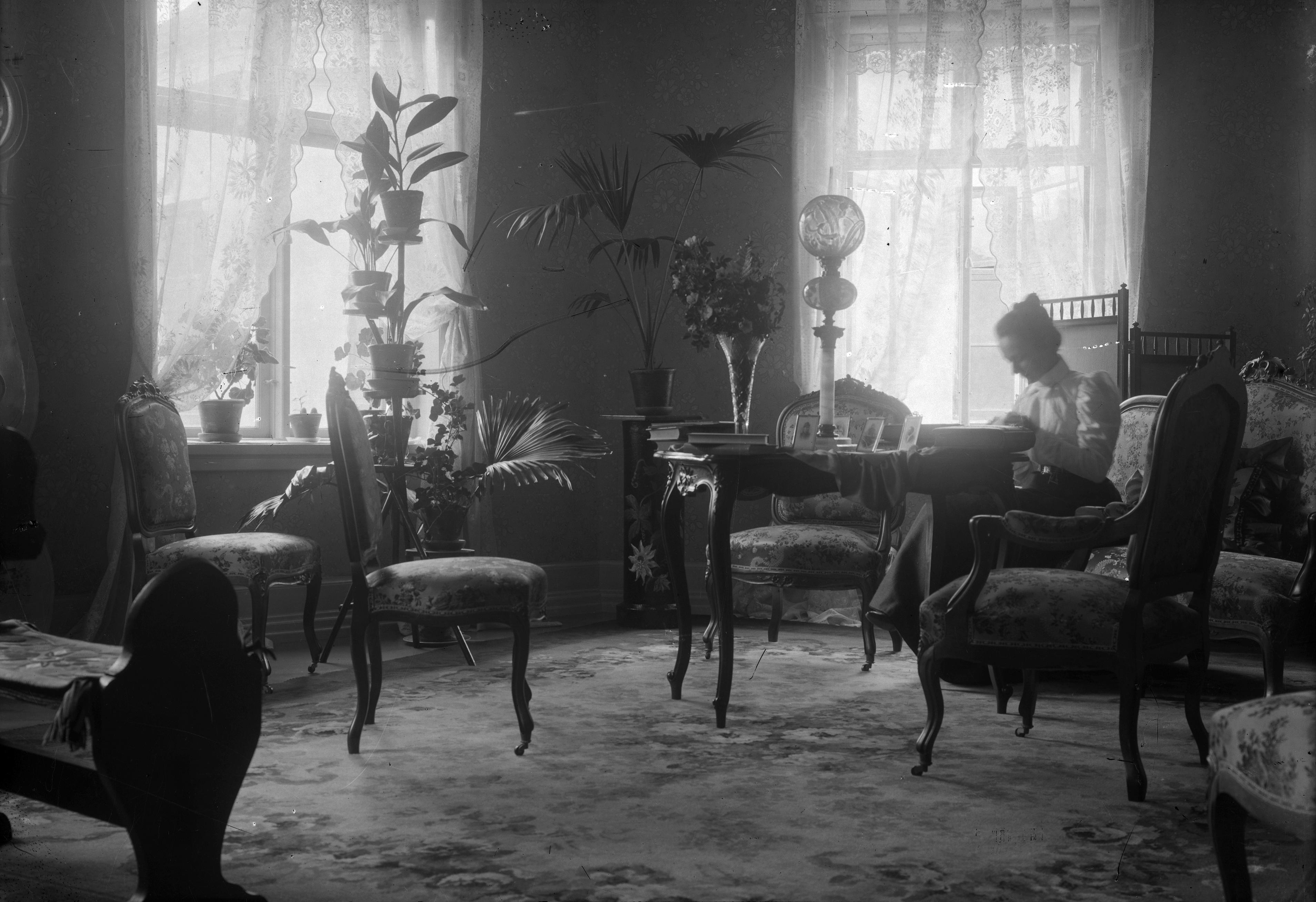 Rumsinteriör, kvinna virkar.