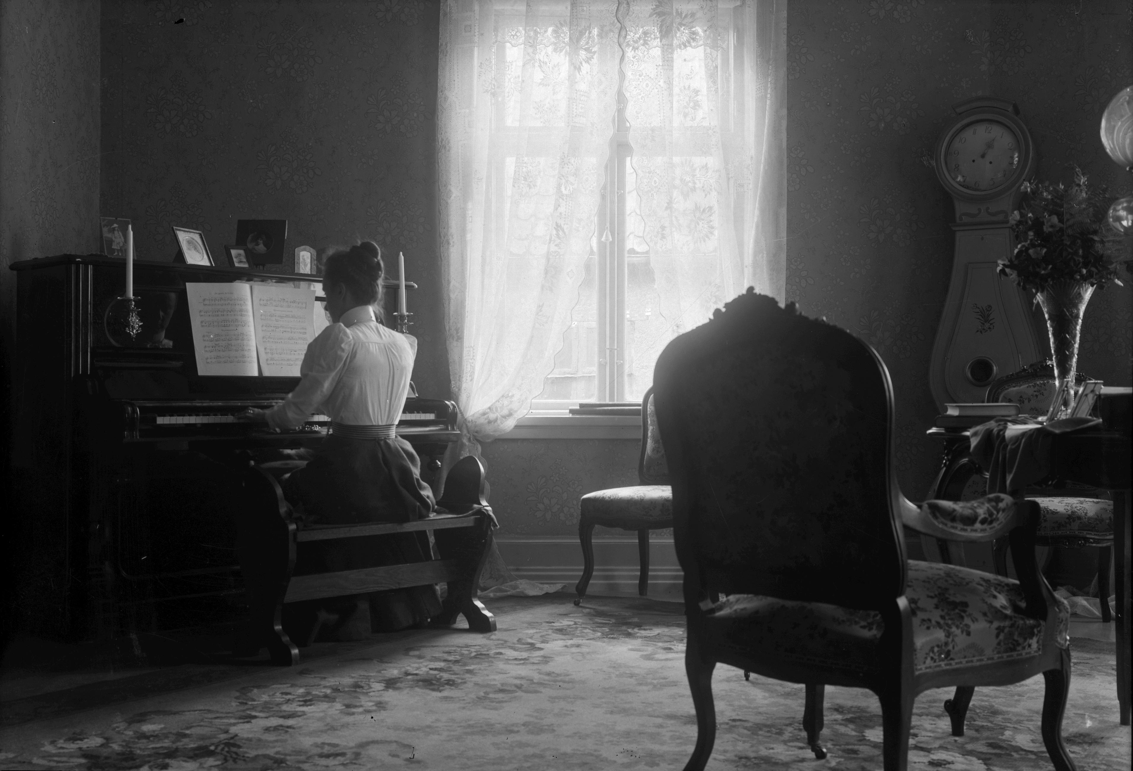 Rumsinteriör, kvinna vid pianot. Moraklocka.