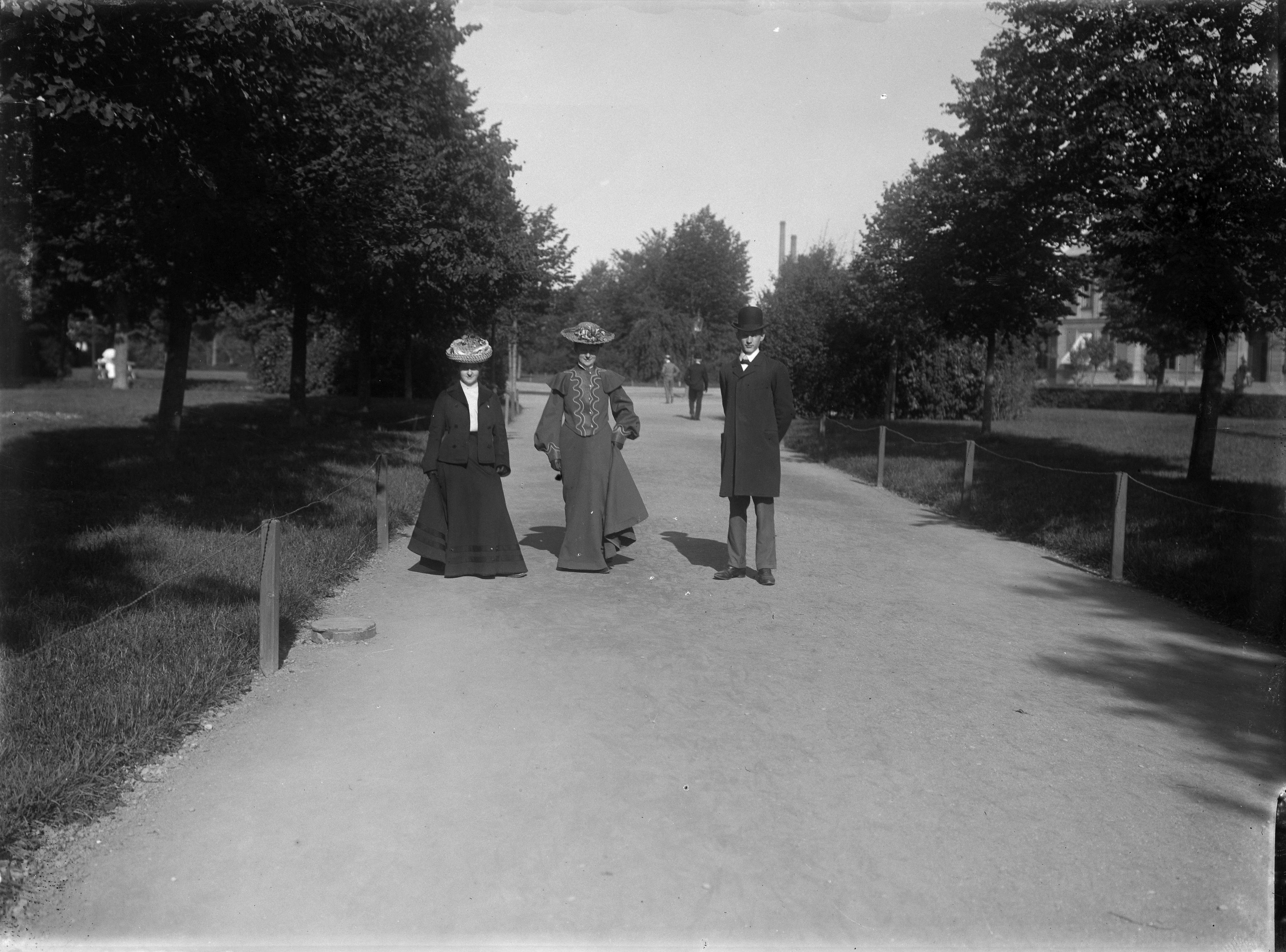 Två kvinnor och en man i parken. Stora hattar, långkjolar.