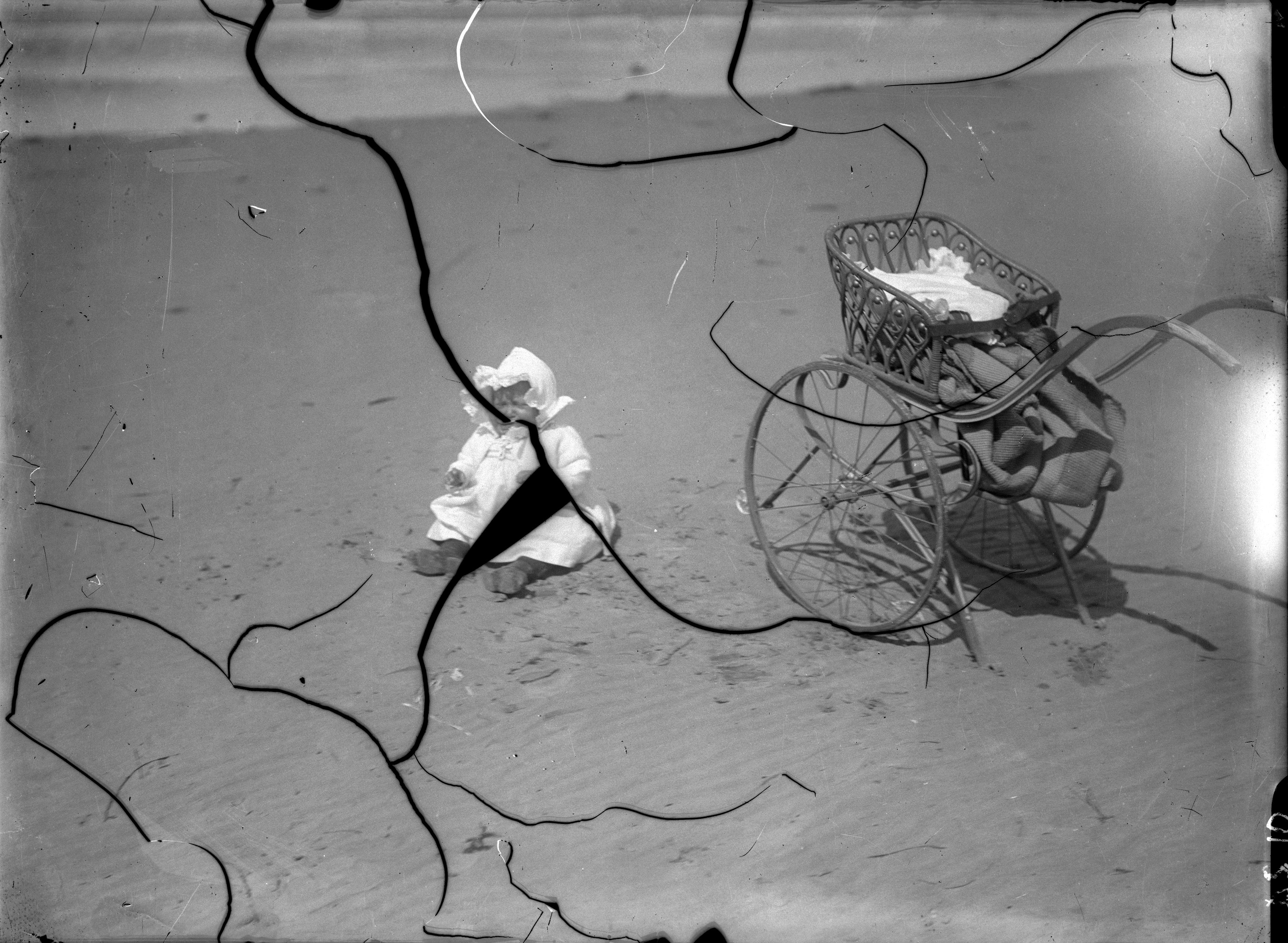Beskrivning: Barn och barnvagn på stranden