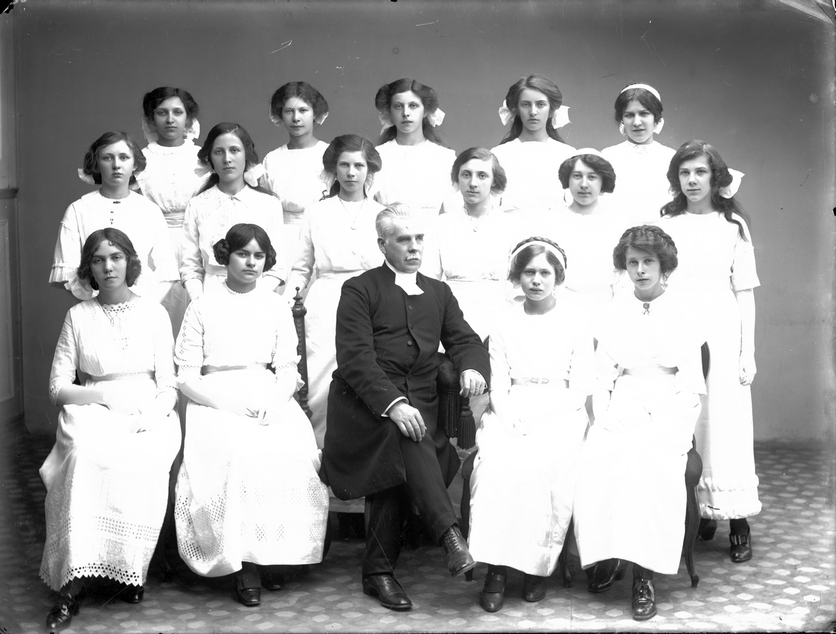 Regementspastor Gustaf Wetterlund med konfirmander. Vänersborg