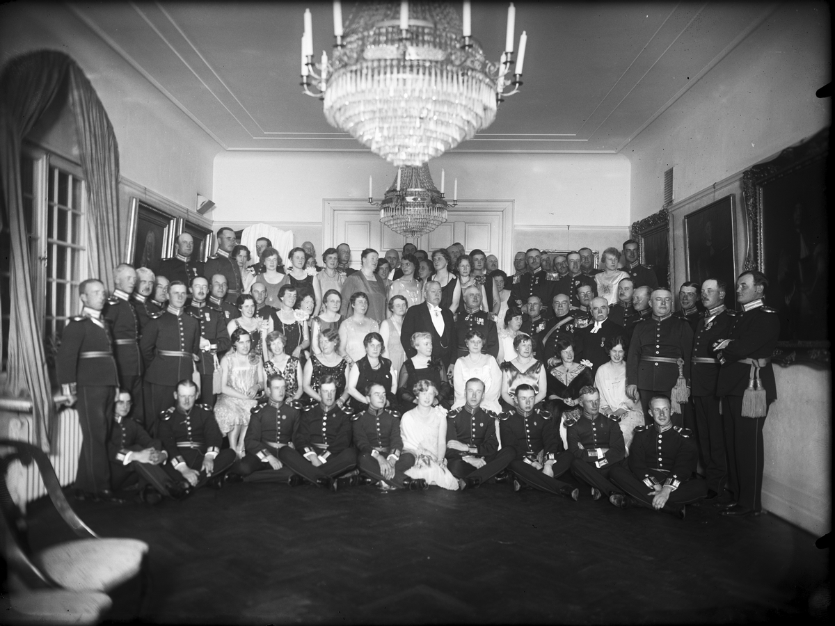 Gruppbild inomhus. Regementets officerare med fruar. Vänersborg