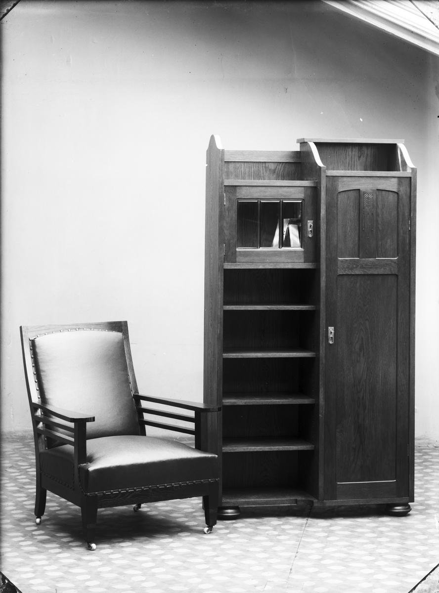 Titel: Möbler Slöjdtekniska skolan Vänersborg. Bokhylla, Fåtölj.
