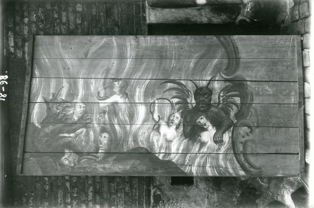 Beskrivning: Fotografi föreställande del av det bemålade innertaket från Skånes Fagerhults äldre kyrka (revs år 1900). Scen ur helvetet, med horn- och svansbeklädda djävular samt människor i skärselden. Scenen uppmålad på sex sammanfogade bräder, fotograferade på Helsingborgs stadsmuseums innergård.