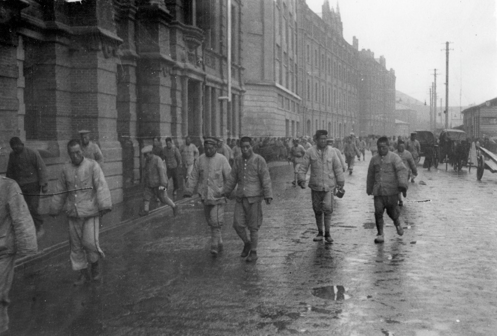 Krigsfångar/avväpnade soldater ur Nordarmén inom den europeiska koncessionen i Shanghai. Fabians beskrivning: ”På måndagsnatten avtågade nämligen i all tysthet c:a 10,000 av Shanghais tappra inhemska ’försvarare’, efterlämnade endast några tusen man av Nordarmén […] Något kraftigare motstånd av Nordarmén bjöds nog icke, men man förskansade sig här och där i husen, på norra järnvägsstationen och på polisstationerna. […] De av Nordarmén, som icke föllo offer för sina sydliga bröders kulor eller bödelsvärd, störtade sig mot settlementets barrikader, men här möttes de av en välriktad eld från de europeiska trupperna, som hade order att icke släppa in några beväpnade. Då ju avväpningen ej kunde försiggå tillräckligt snabbt, utspelades här ömkansvärda scener, svårt beträngda som de arma satarne voro mellan de framryckande kantonesarne och den vita spärren. Inemot ett tusental av Nordarméns trupper lyckades efter skedd avväpning i skilda grupper på några hundratal vid de olika barrikaderna komma in i Settlementet, där de omhändertogs av japaner och britter. […] En bedrövlig syn erbjöd dessa stackars trasiga, smutsiga, utmärglade rester av den f. d. stolta Nordarmén, som för kort tid sedan förklarat sig väl i stånd att försvara Shanghai och Nordkina mot de anryckande ’upprorsmännen’ från Kanton. De utgjordes mest av helt ungt folk, många knappt fullvuxna. Trots sitt elände sågo de glada ut att hava räddat livet åtminstone. Välvilliga européer stucko till dem cigaretter och livsmedel. De senare måtte ha varit högt efterlängtade att döma av den snabbhet, varmed de försvunno i de hungriga krigarne. Det sista jag såg av dem var några hundratal nere vid hamnen. Där hade de stått i ett dygn, tätt packade som i en fårfålla, utsatta för väder och vind, ej ens i stånd att lägga sig ned. Mat fingo de ju, men ej för mycket och ej för ofta.” [Citat ur boken]