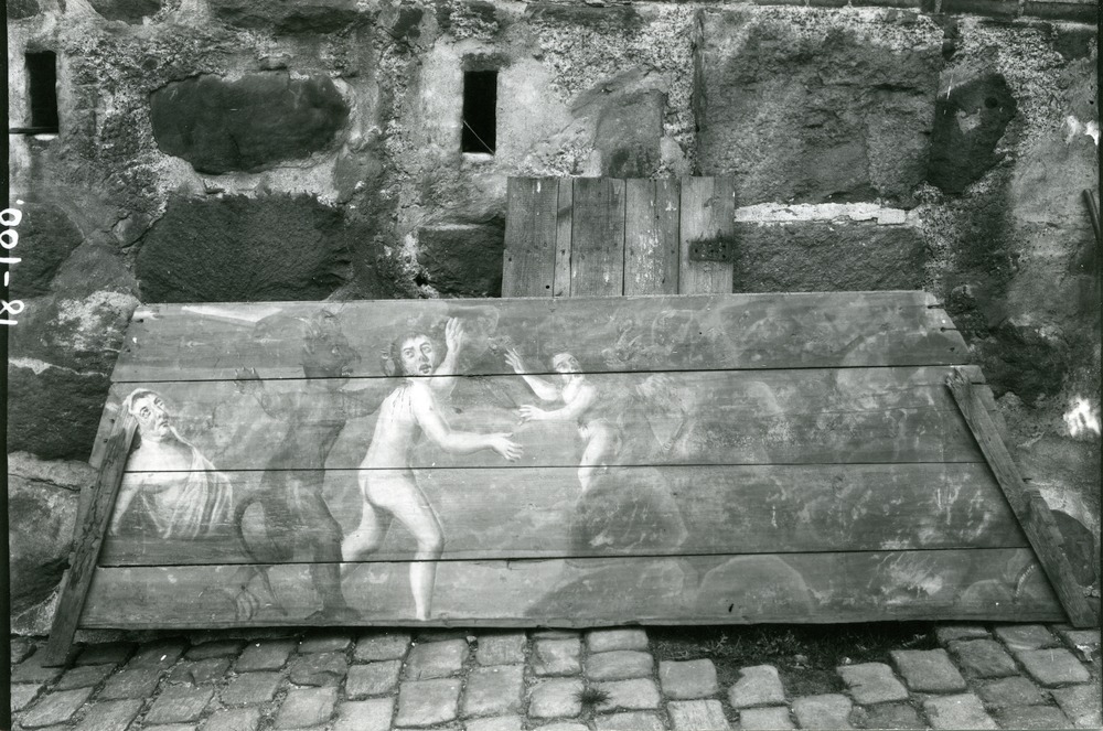 Fotografi föreställande del av det bemålade innertaket från Skånes Fagerhults äldre kyrka (revs år 1900). Scen ur helvetet, med horn- och svansbeklädd djävul samt människor. Scenen uppmålad på fyra sammanfogade bräder, som vid fototillfället står lutade mot en stenvägg på Helsingborgs stadsmuseums innergård.