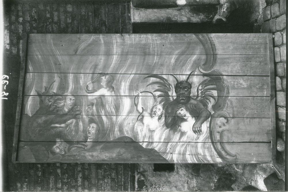 Fotografi föreställande del av det bemålade innertaket från Skånes Fagerhults äldre kyrka (revs år 1900). Scen ur helvetet, med horn- och svansbeklädda djävular samt människor i skärselden. Scenen uppmålad på sex sammanfogade bräder, fotograferade på Helsingborgs stadsmuseums innergård.