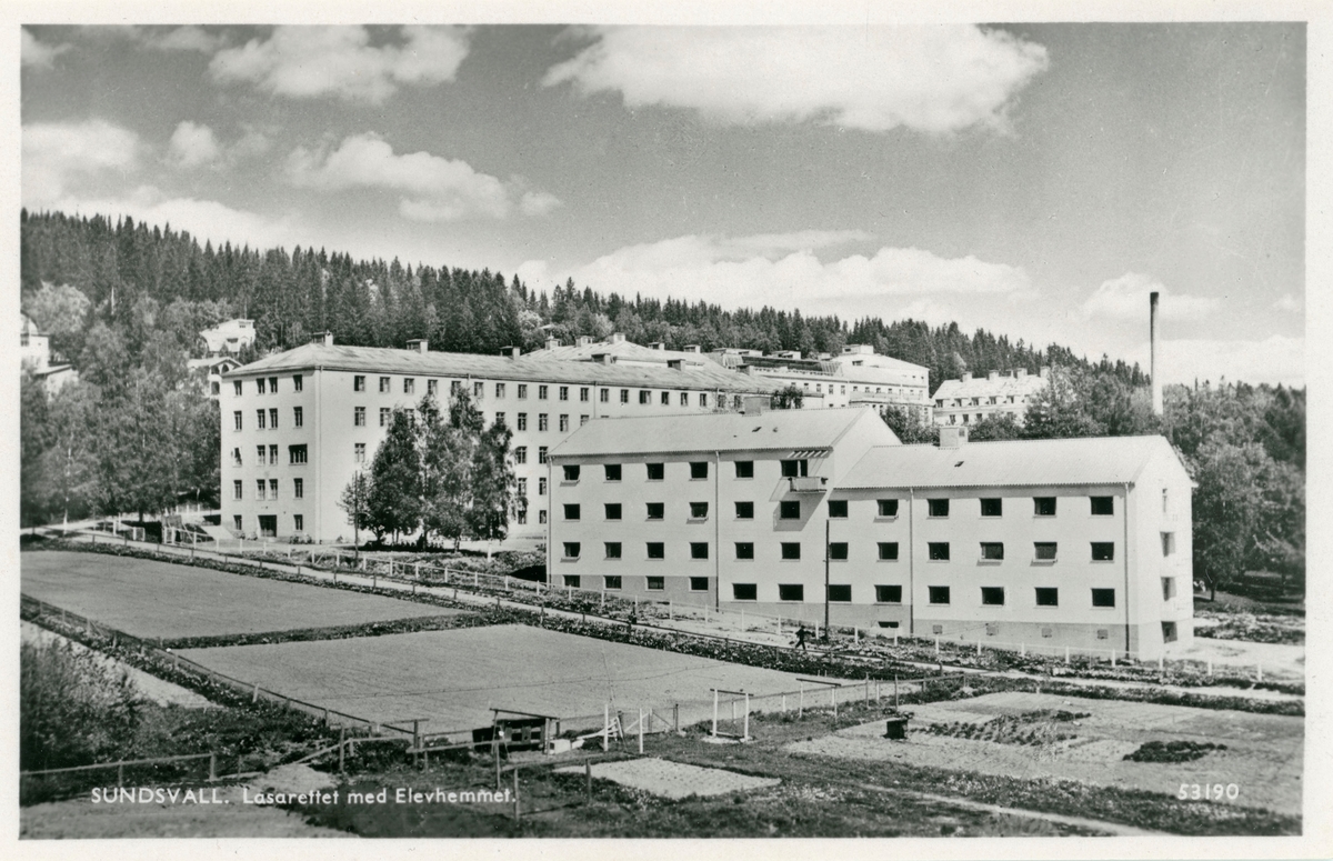 Länslasarettet med elevhemmet närmast. Taget mot norr. Vykort.
