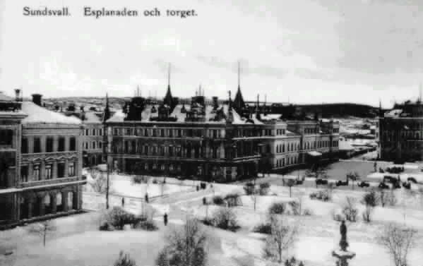 Från vänster kv Pan 5/Sundsvalls enskillda bank, kv Rätten 1, kv Stadshuset 1 och från höger kv Nyttan 6/Hirschska huset och Stora torget. På Stora torget finns hästar och vagnar samt kuskar. I förgrunden Vängåvans park och Esplanaden.