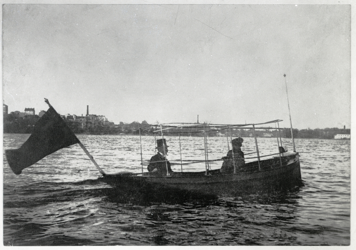 [från fotobeskrivningen:] "Mannen till rors i båten iförd hög hatt är Henning Forslund." "Båtens längd 7 m Maskin 1 cyl. 3 hkr motor Fart 5,5 knop" "Föreningen Sveriges Sjöfartsmuseum i Stockholm No. A 988"