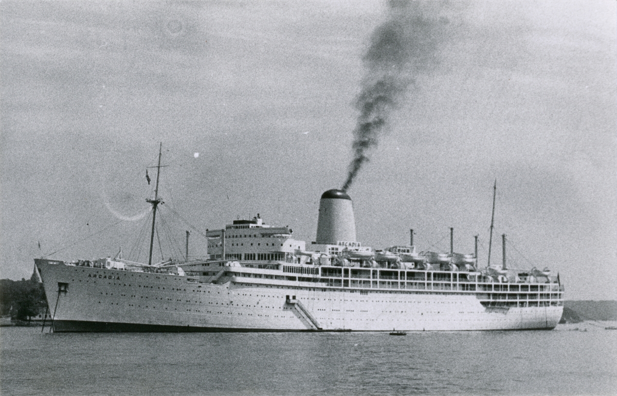 Foto i svartvitt visande passagerarturbinfartyg ARCADIA av London för ankars