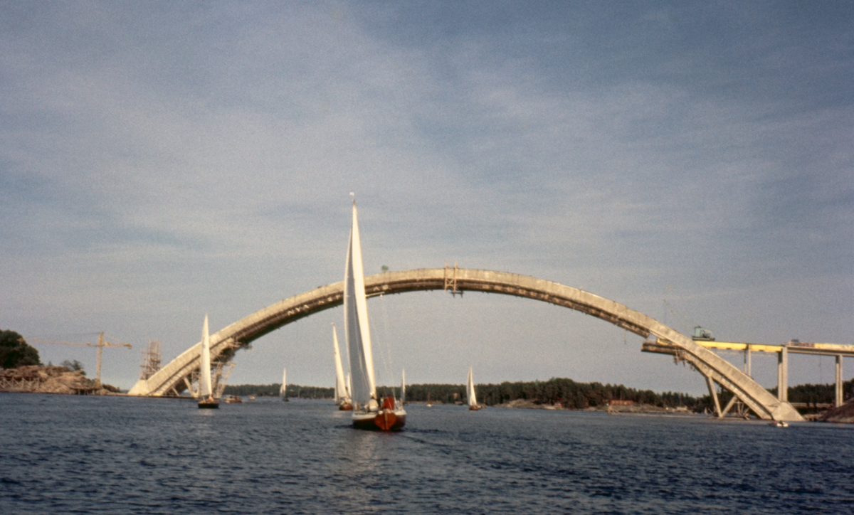 Segelbåtar i Brevikssundet. I bakgrunden Djuröbron under uppförande.
