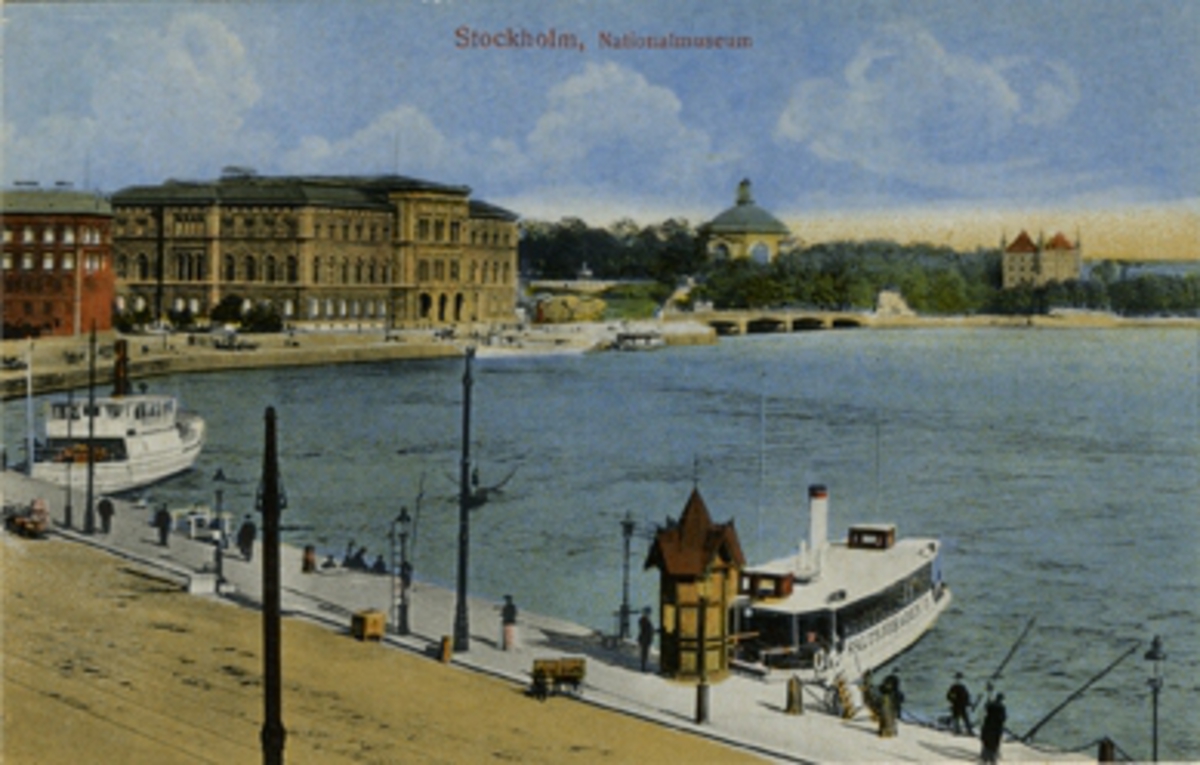 Stockholm, vy över Södra Blasieholmshamnen med Nationalmuseum i bakgrunden. Kolorerat vykort, färglitografi.