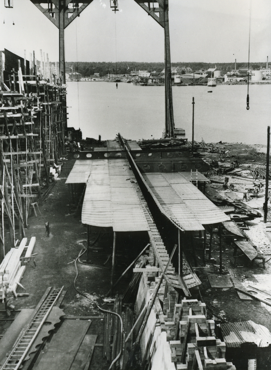 Oskarshamns varv. Stapelbädd till lastångfartyget ATAIR, 1943.