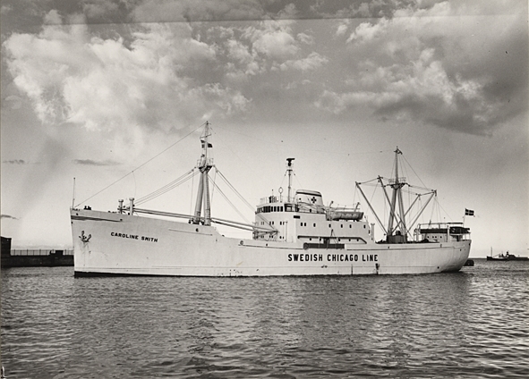 Foto i svartvitt visande lastmotorfartyget "CAROLINE SMITH" i Köpenhamn i slutet på 1950-talet.
