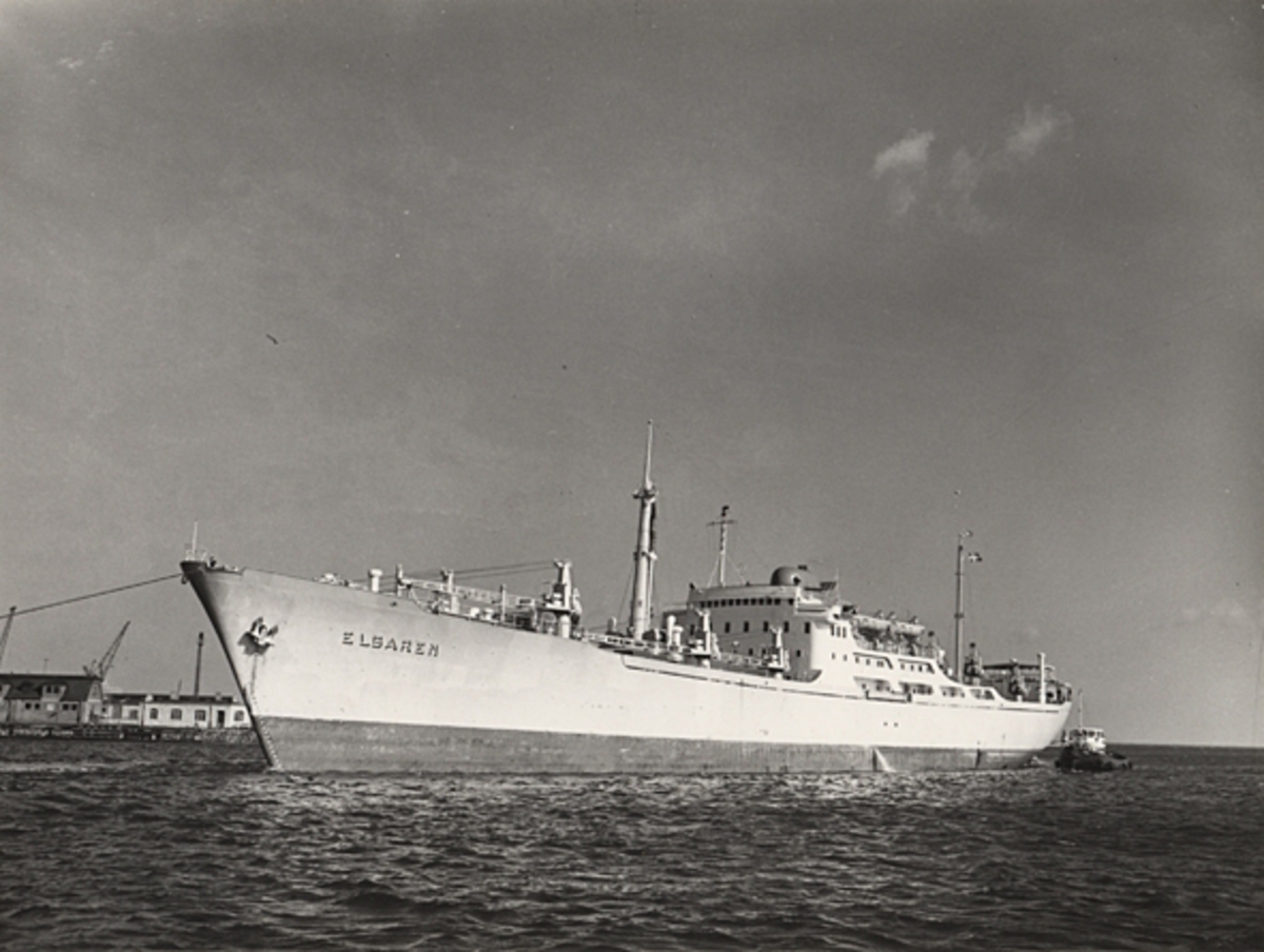 Foto i svartvitt visande lastmotorfartyget "ELGAREN" taget i Köpenhamn under mars månad 1961.