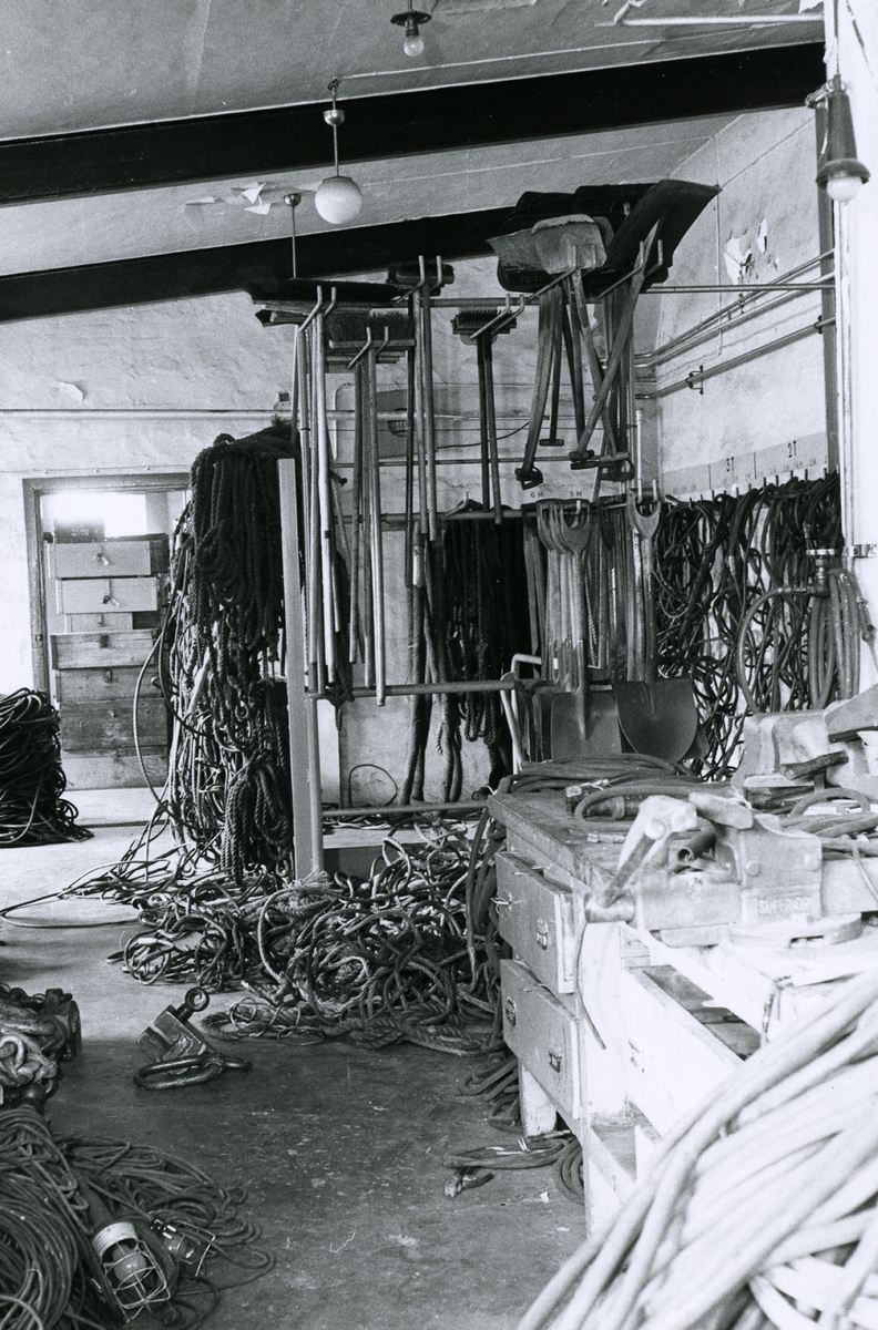Oskarshamns varv. Bänken till höger plats för provning av el- och svetsmaskiner. I bakgrunden lyftverktyg.