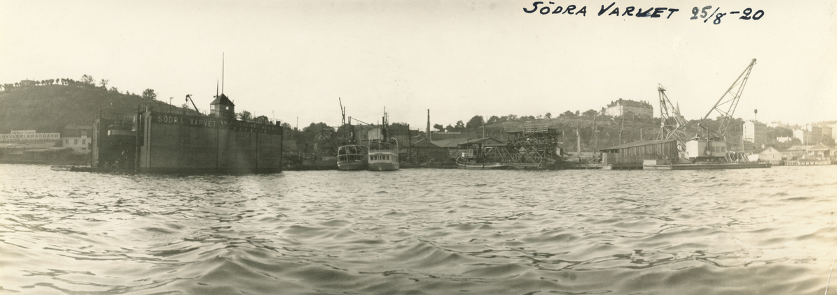 Vy från vattnet över Södra varvet och kringliggande verksamhet.