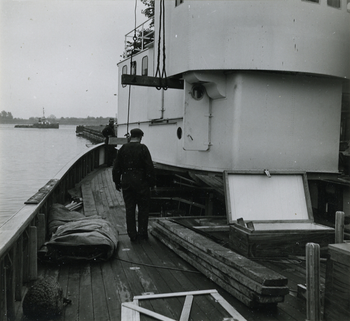 Förmannen Hans Persson dirigerar. Obs. balkarna som sticker ut genom husets ventiler och vilar i wirarna.