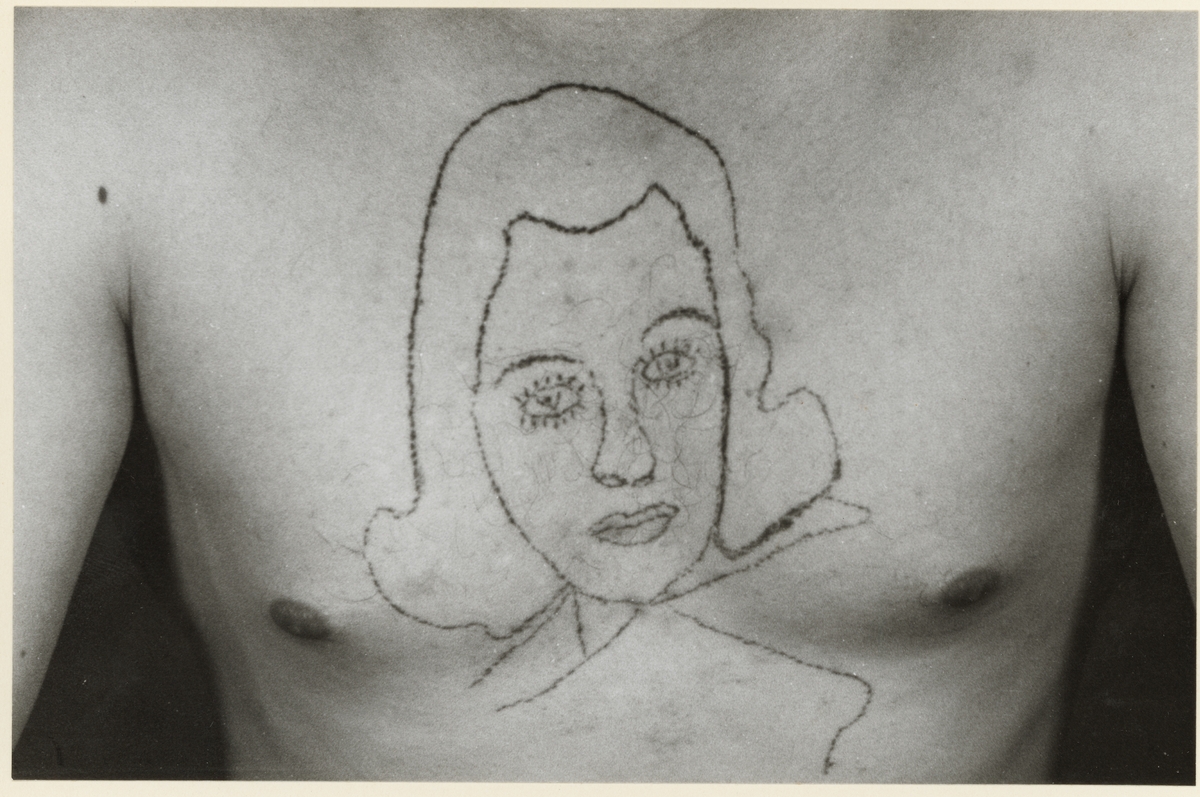 Tatuering på bröstet av ett kvinnohuvud ej färdigt. Utfört av en sjöman i Västerås, utan betalning.