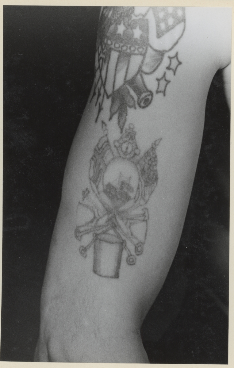 Tatueringar på höger överarm: U.S. vapen i blått, rött och grönt, utfört i USA 1926.