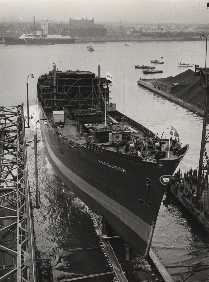 Kylmotorfartyget SARGODHA löper av stapeln i jan. 1956.