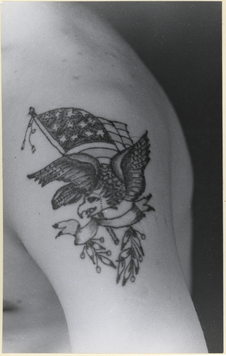 Tatuering i rött och blått på vänster överarm utförd i Rotterdam 1940. Pris 2,50.