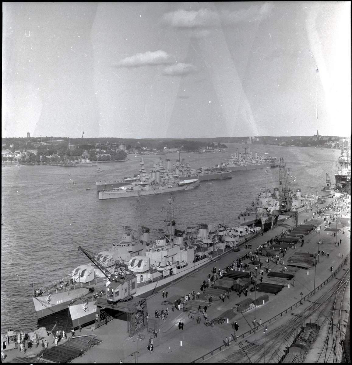 [från fotobeskrivningen:] [---] "Amerikansk eskader på besök i Stockholm omkr. den 13 okt. 1945. Bland de fartyg vilka äro förtöjda mellan bojar märken pansarskeppet SVERIGE - kustflottans flaggskepp." [sic]