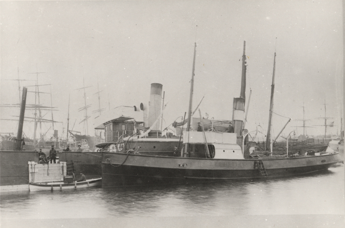 I bakgrunden lastångfartyget SJOFNA liggande i Revals hamn för tätningsarbeten.