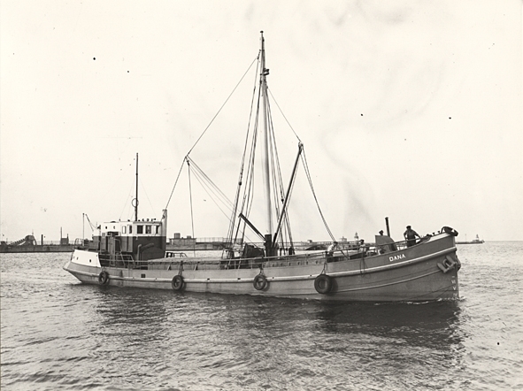 Foto i svartvitt visande lastmotorfartyget "DANA" i Köpenhamn sommaren 1953.