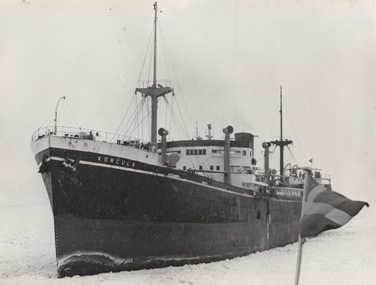 Lastångfartyget KOCULA av Dubrovnik, forcerande Öresundsisen i början av 1963.