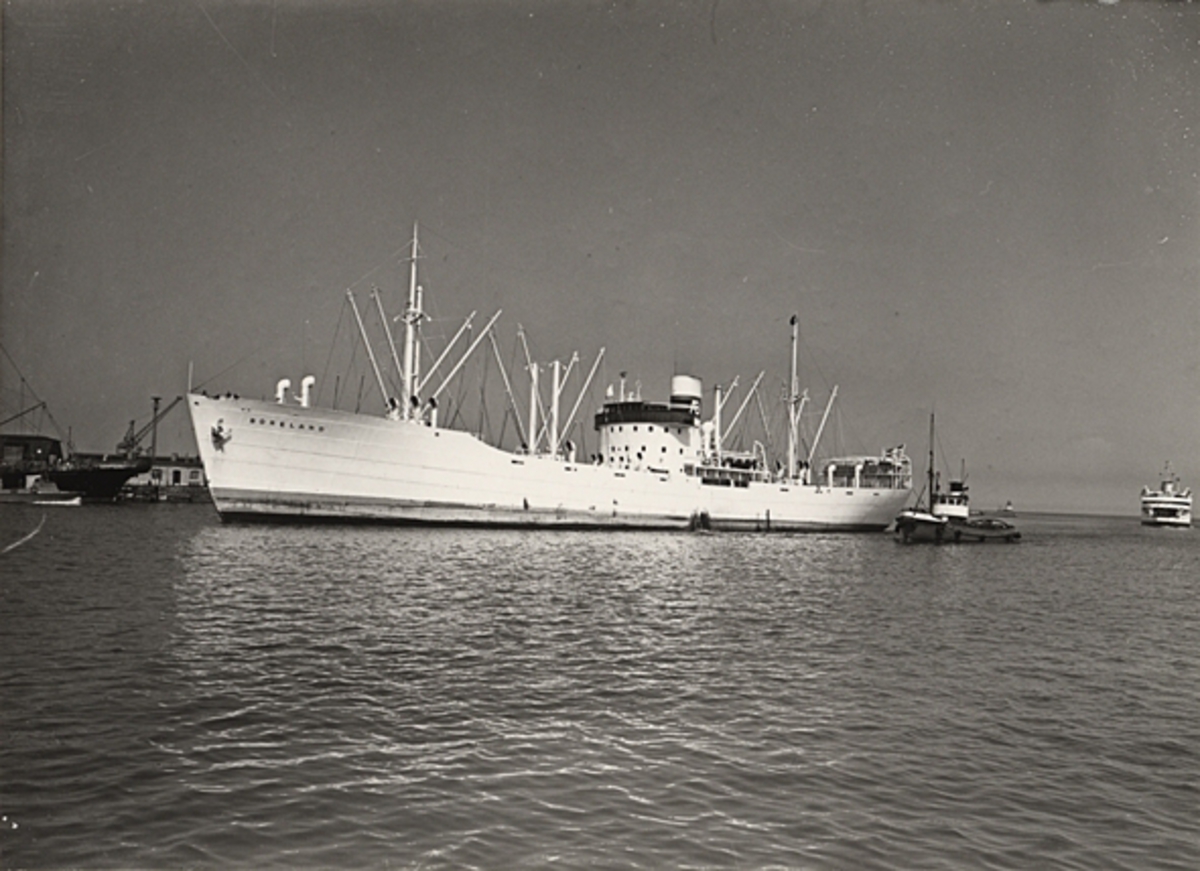 Foto i svartvitt visande lastmotorfartyget "BORELAND"i Köpenhamn under år 1954.