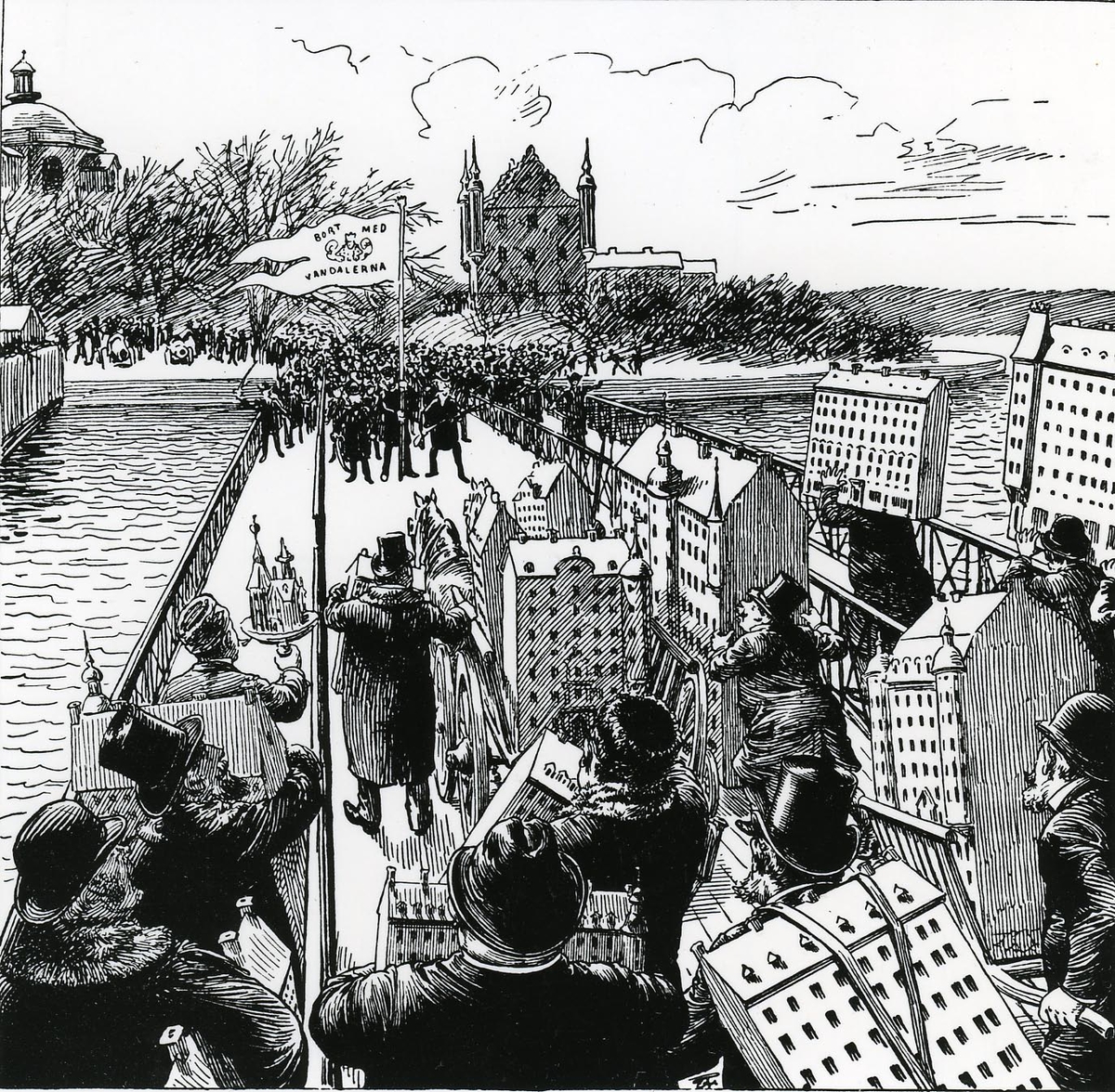 Byggmästare och fastighetsmatadoren, vädrande morgonluft vid talet om Skeppsholmens bebyggelse försö- forsera bron men mötes av dess försvarare fylkade under en fana med S:t Eriks bild och devisen "BORT MED VANDALERNA".