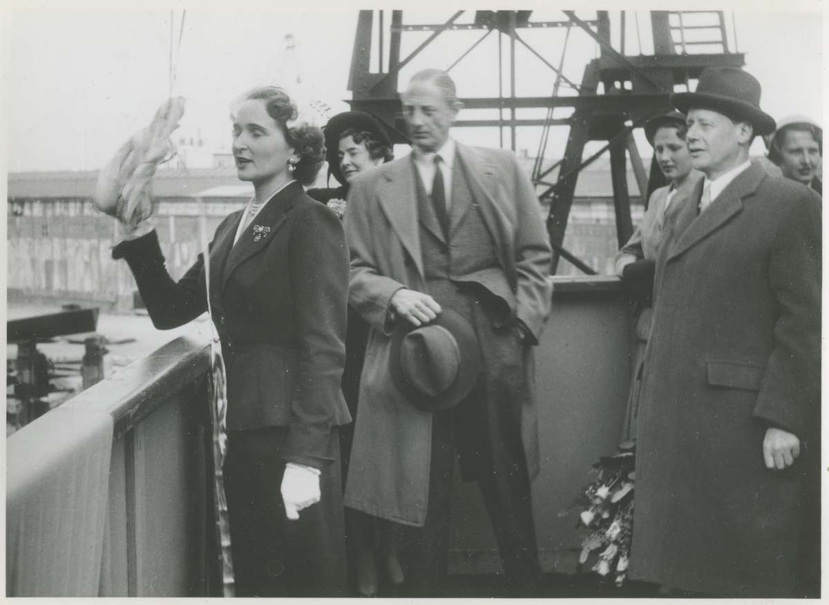 "Foton från sjösättning och provtur M/S Itajai 31 januari resp. 10 maj 1951 Gudmor: Elsie Deeke." Mannen till höger är varvschef Hilding Nielsen.