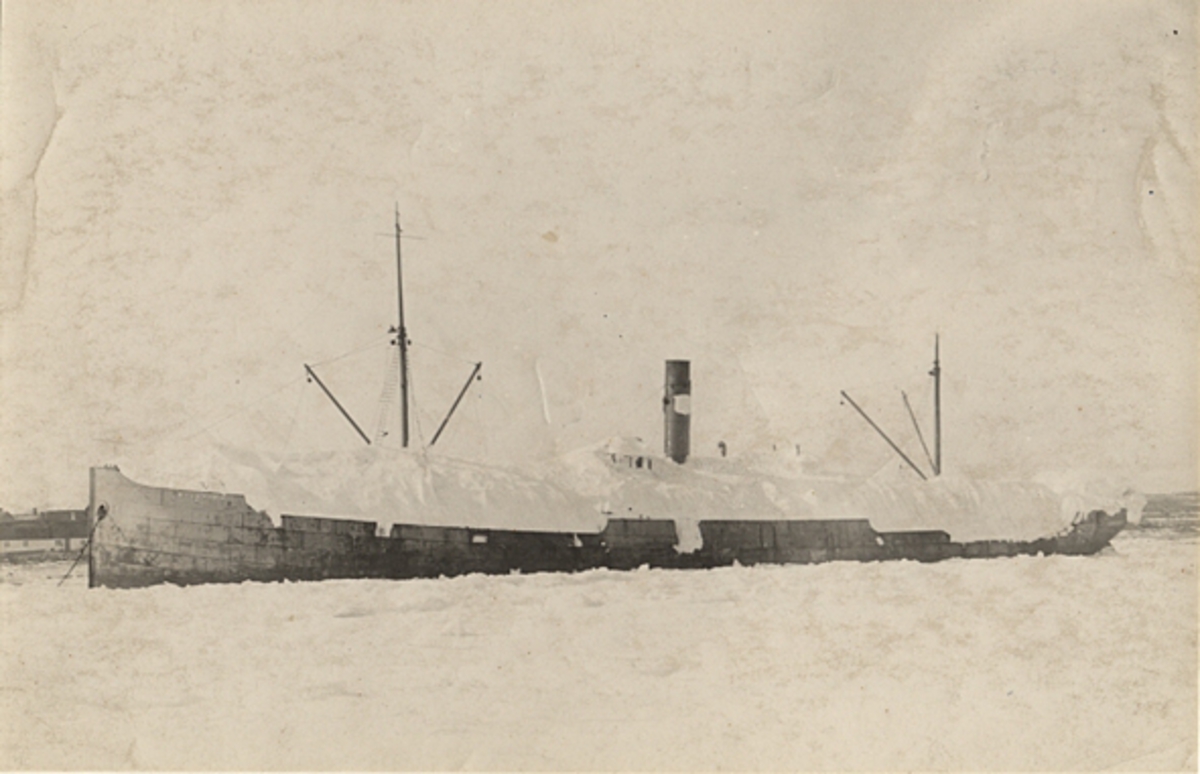 Fartyget strandat och överisat utanför Brantevik 10 jan. 1924. Bärgat av Neptunbolaget. Obs. den översnöade trädäckslasten.
