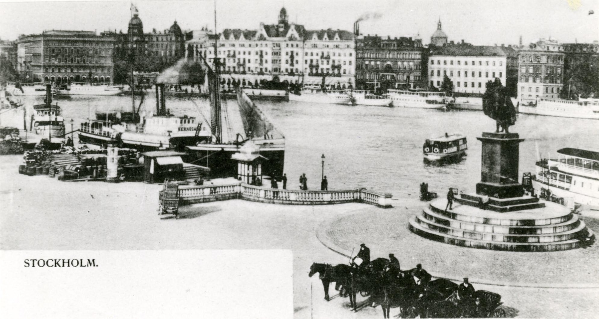 Skeppsbron i Stockholm. Gustaf III Staty och Södra Blasieholmshamnen.