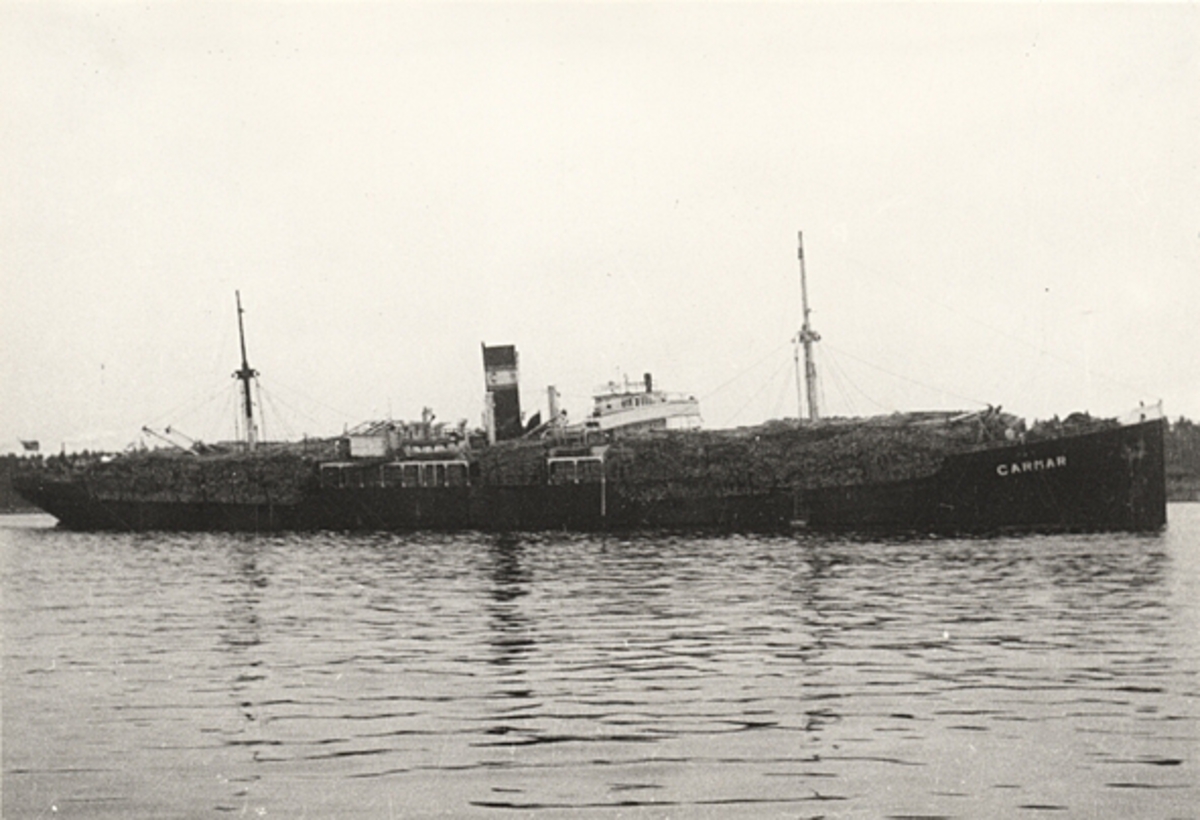 Ångfartyget CARMAR av Panama på utgång. Observera den stora däckslasten.