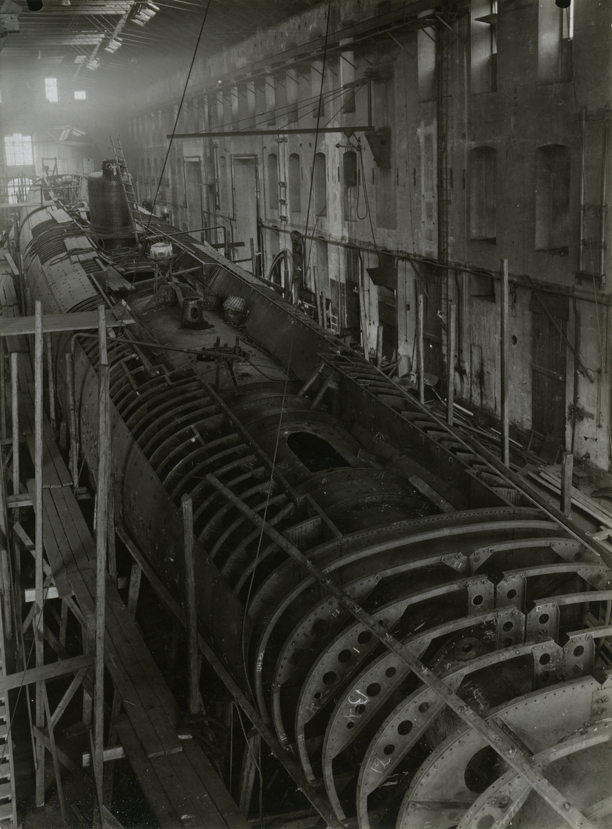 Under byggnad på Örlogsvarvet i Karlskrona. Skrovbyggnaden sedd upp-och akterifrån.